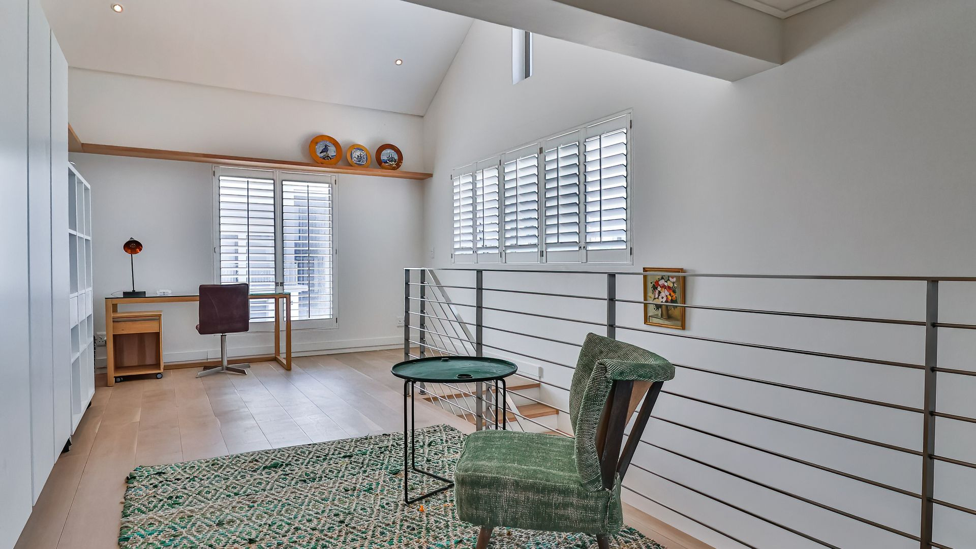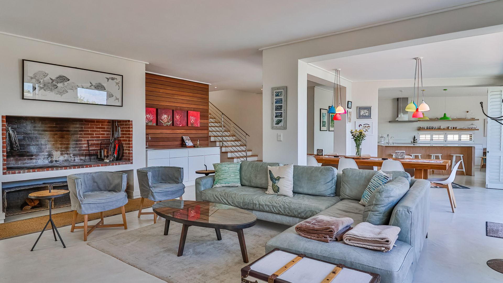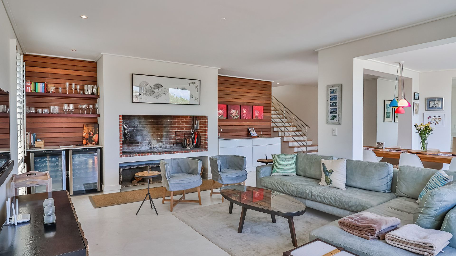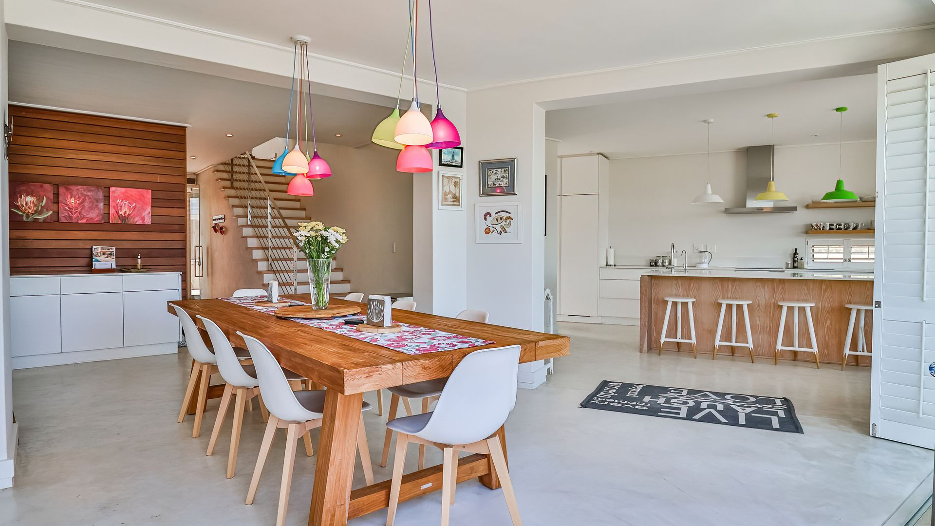 Laid out over two levels, the ground floor opens onto a deck, splash pool and boma ( that's summer sorted). This level is open plan and features screed floors, a built-in braai/fireplace, two living areas, open-plan dining , and a stylish modern kitchen with adjacent scullery. Beautifully appointed throughout, with playful pendant lighting, textured wood panelling and open shelving, the ground floor is designed for gathering, and quality time spent relaxing.