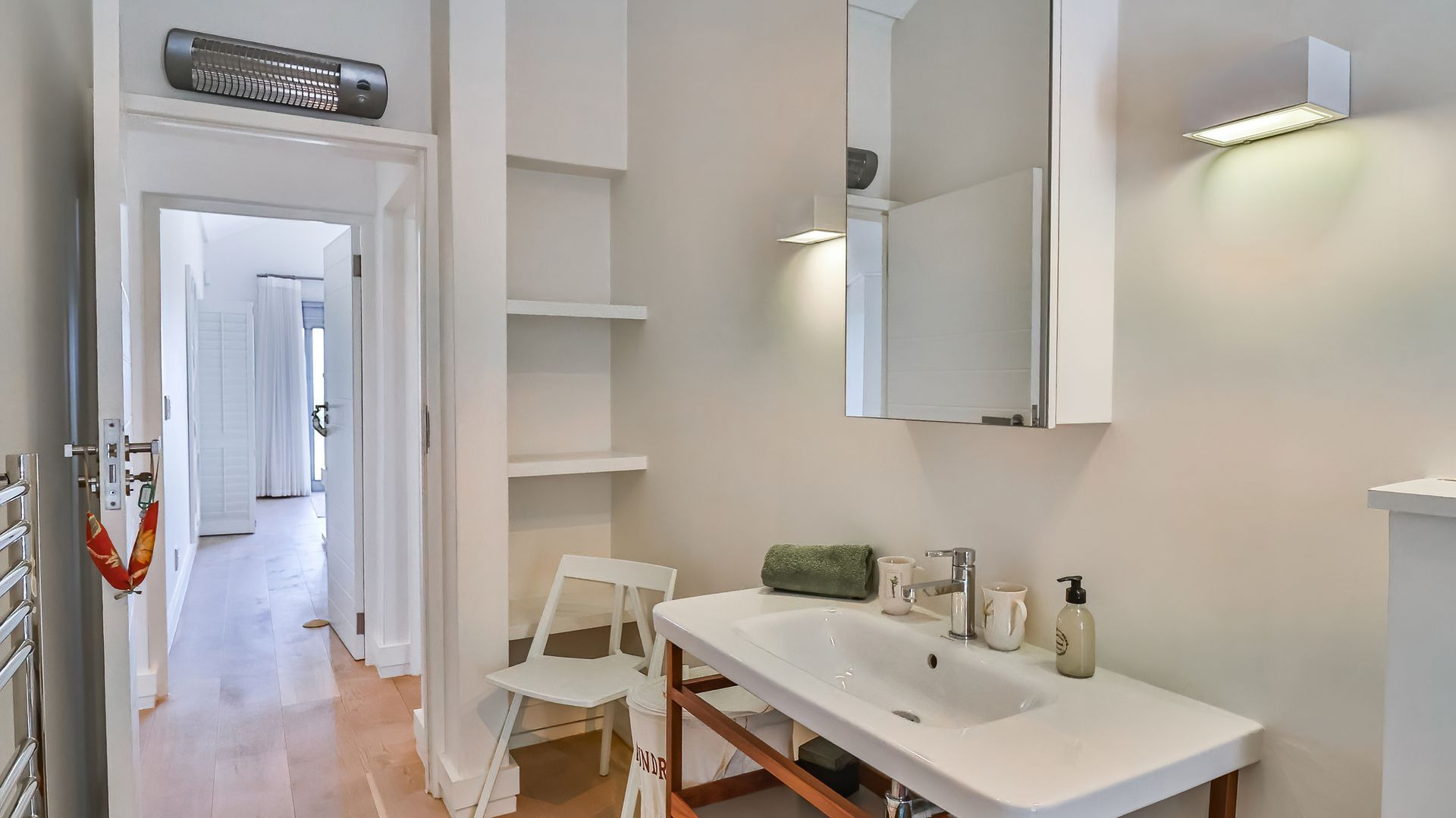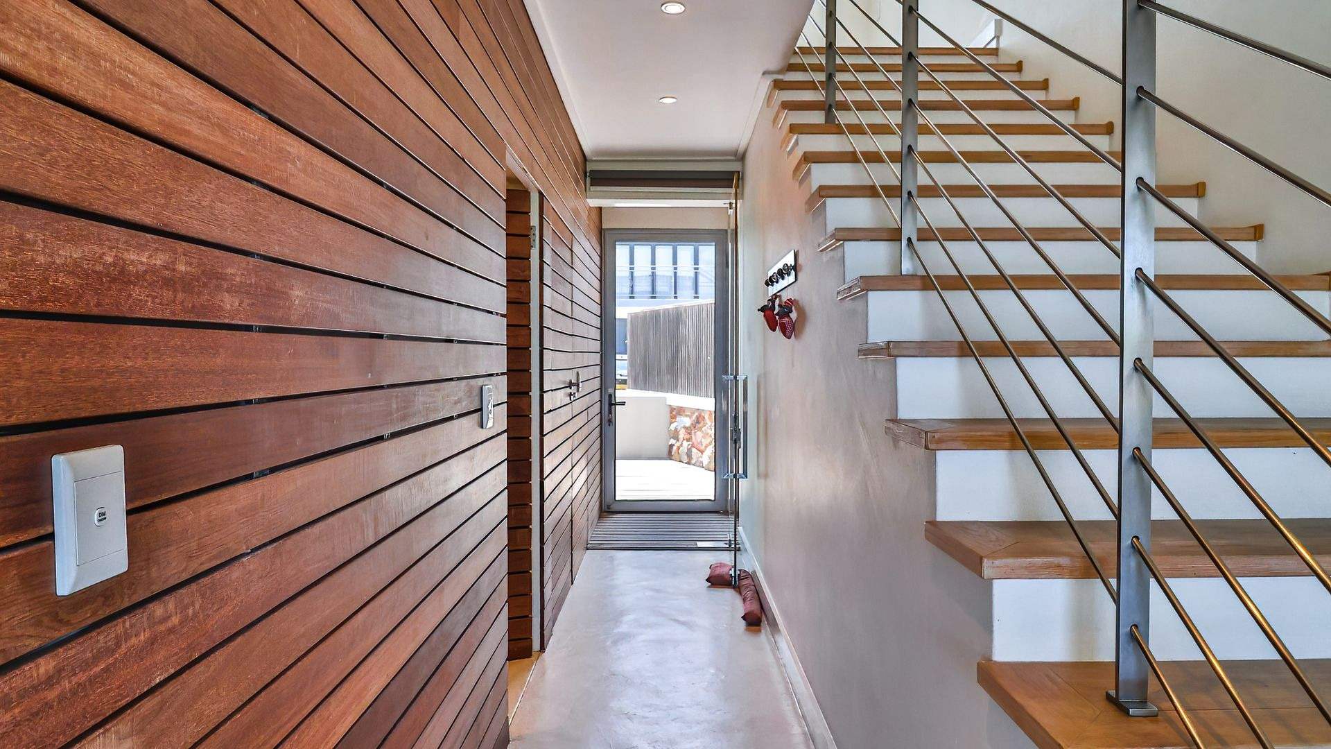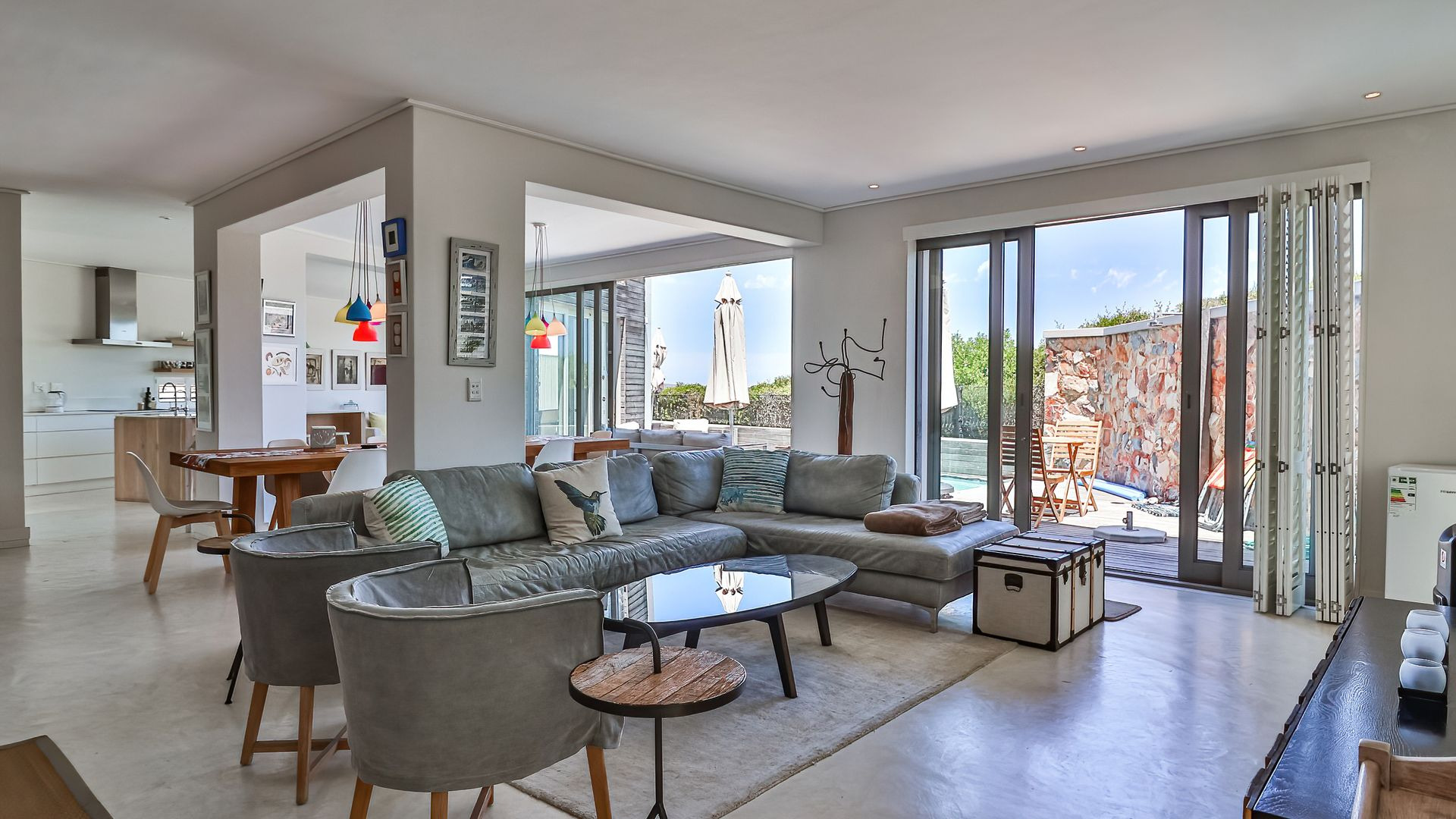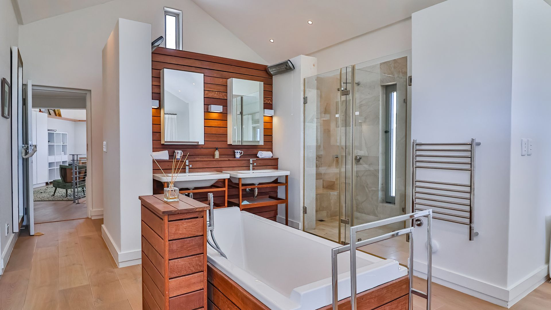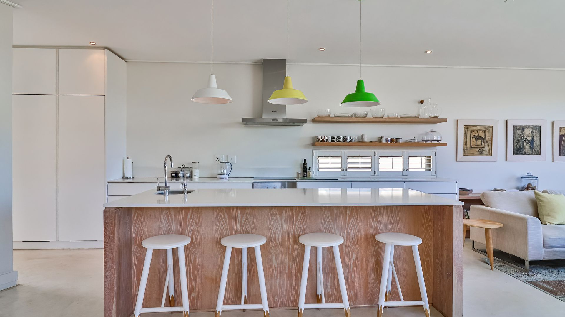 Laid out over two levels, the ground floor opens onto a deck, splash pool and boma ( that's summer sorted). This level is open plan and features screed floors, a built-in braai/fireplace, two living areas, open-plan dining , and a stylish modern kitchen with adjacent scullery. Beautifully appointed throughout, with playful pendant lighting, textured wood panelling and open shelving, the ground floor is designed for gathering, and quality time spent relaxing.