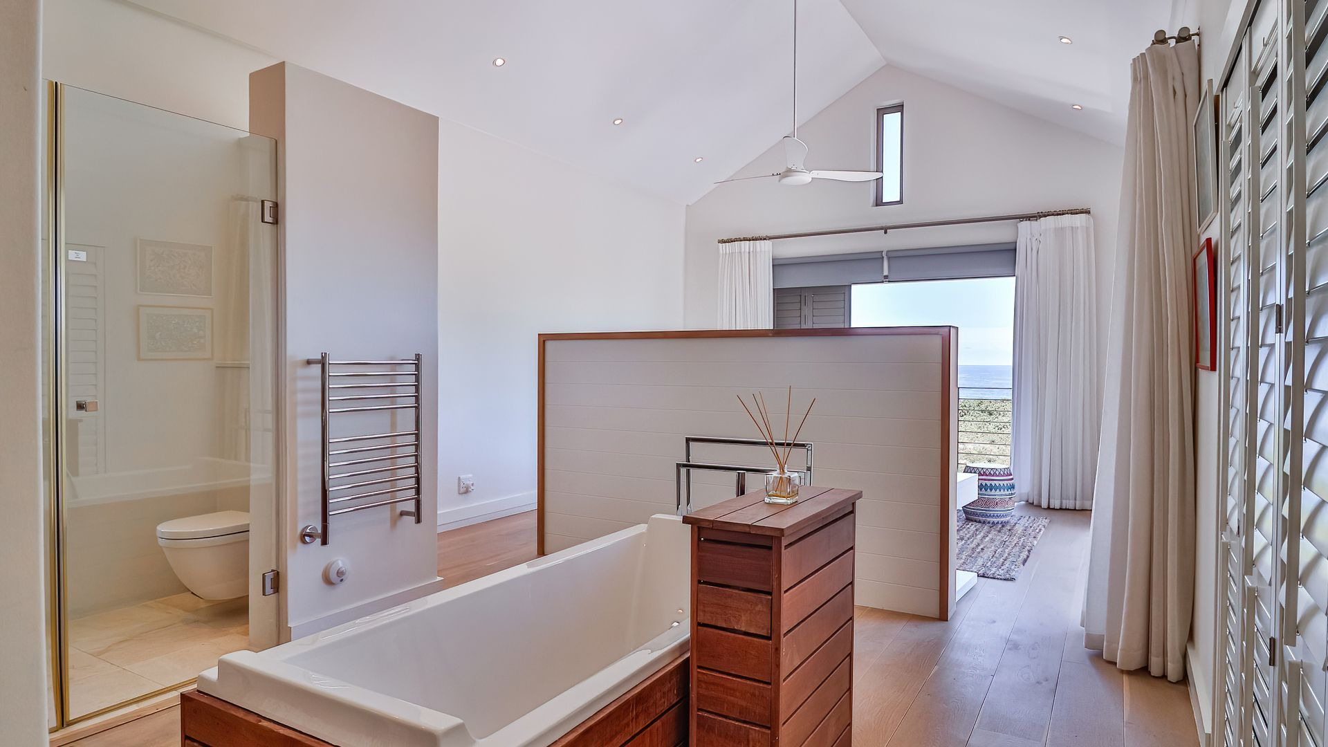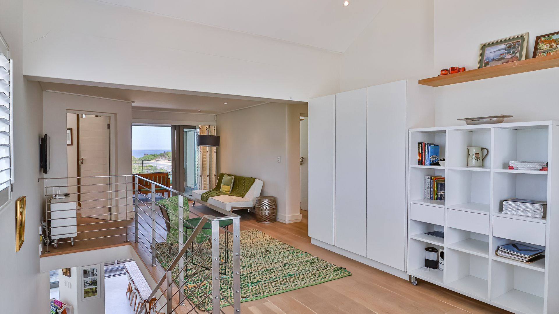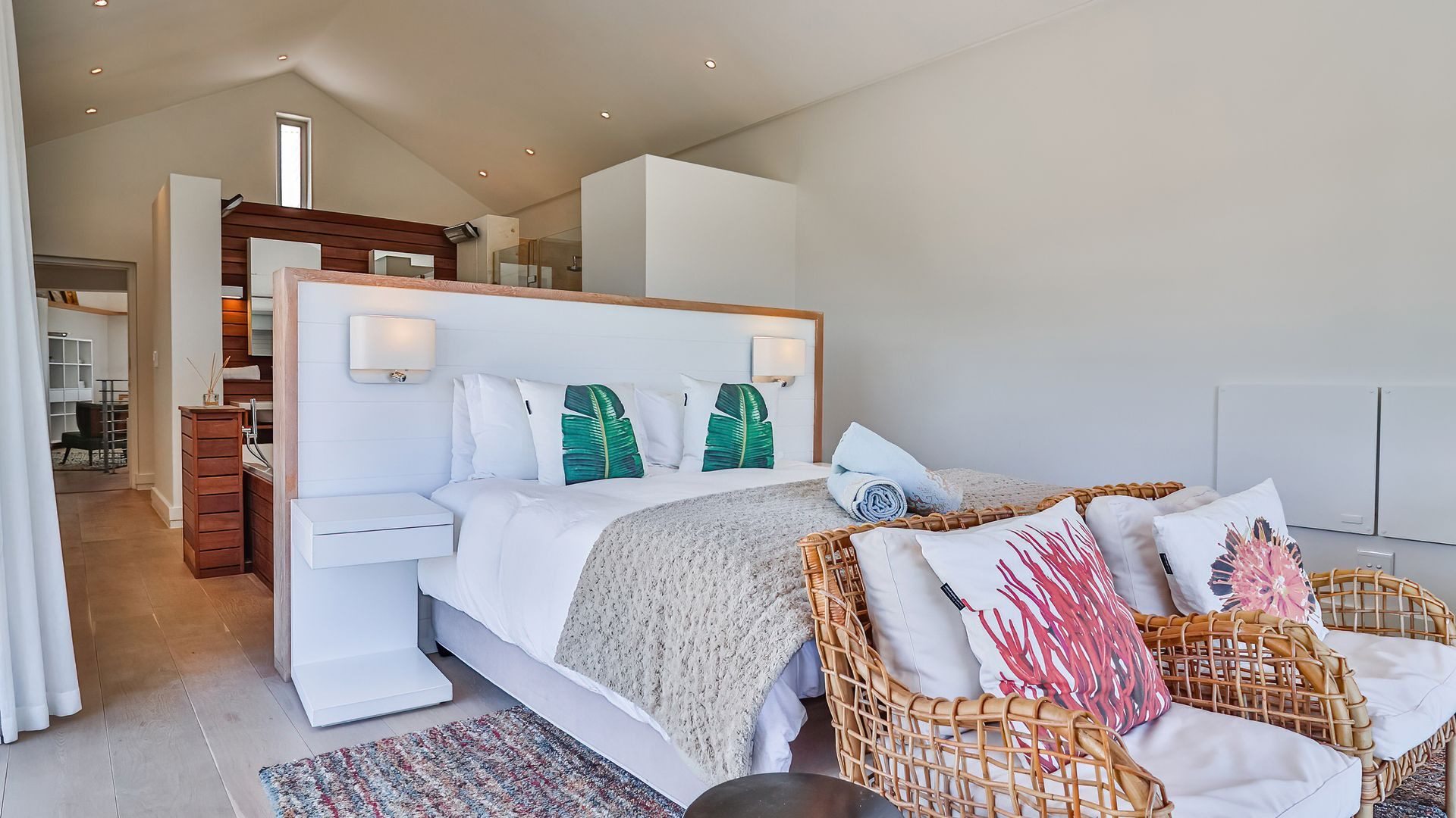 Ascending the stairs, the landing functions as a home office or extra living space, while a shared lounge on the sheltered balcony frames those spectacular views perfectly. Two beautiful en-suite bedrooms overlook the ocean, while a third twin bedroom offers mountain views and an adjacent bathroom.