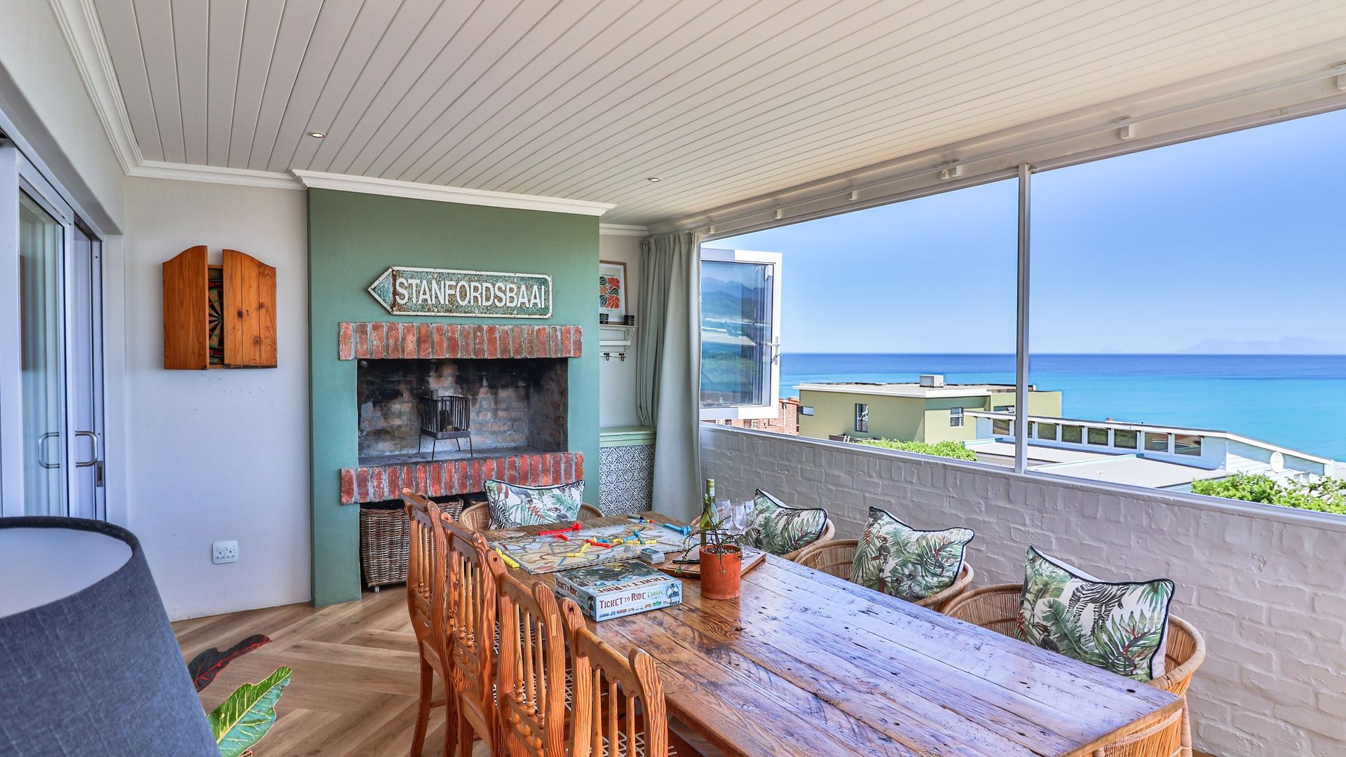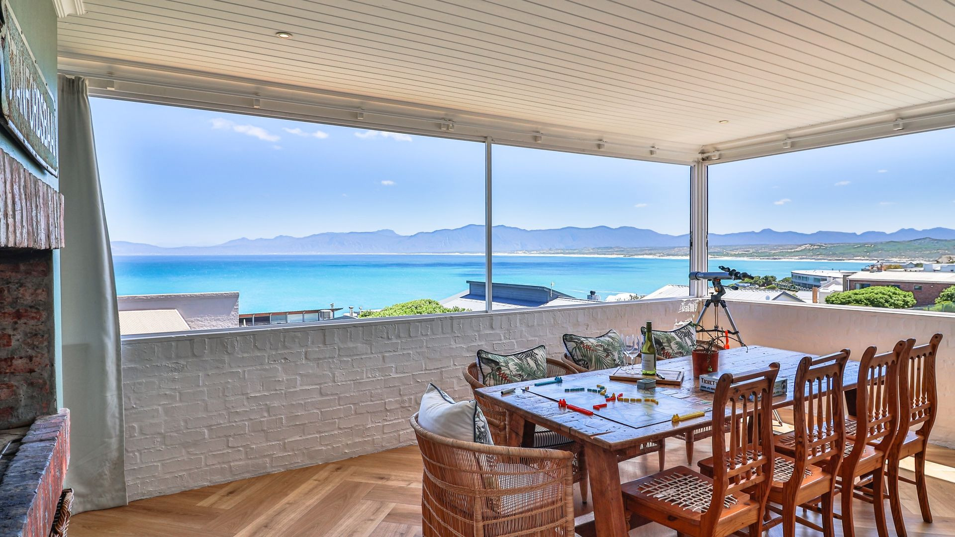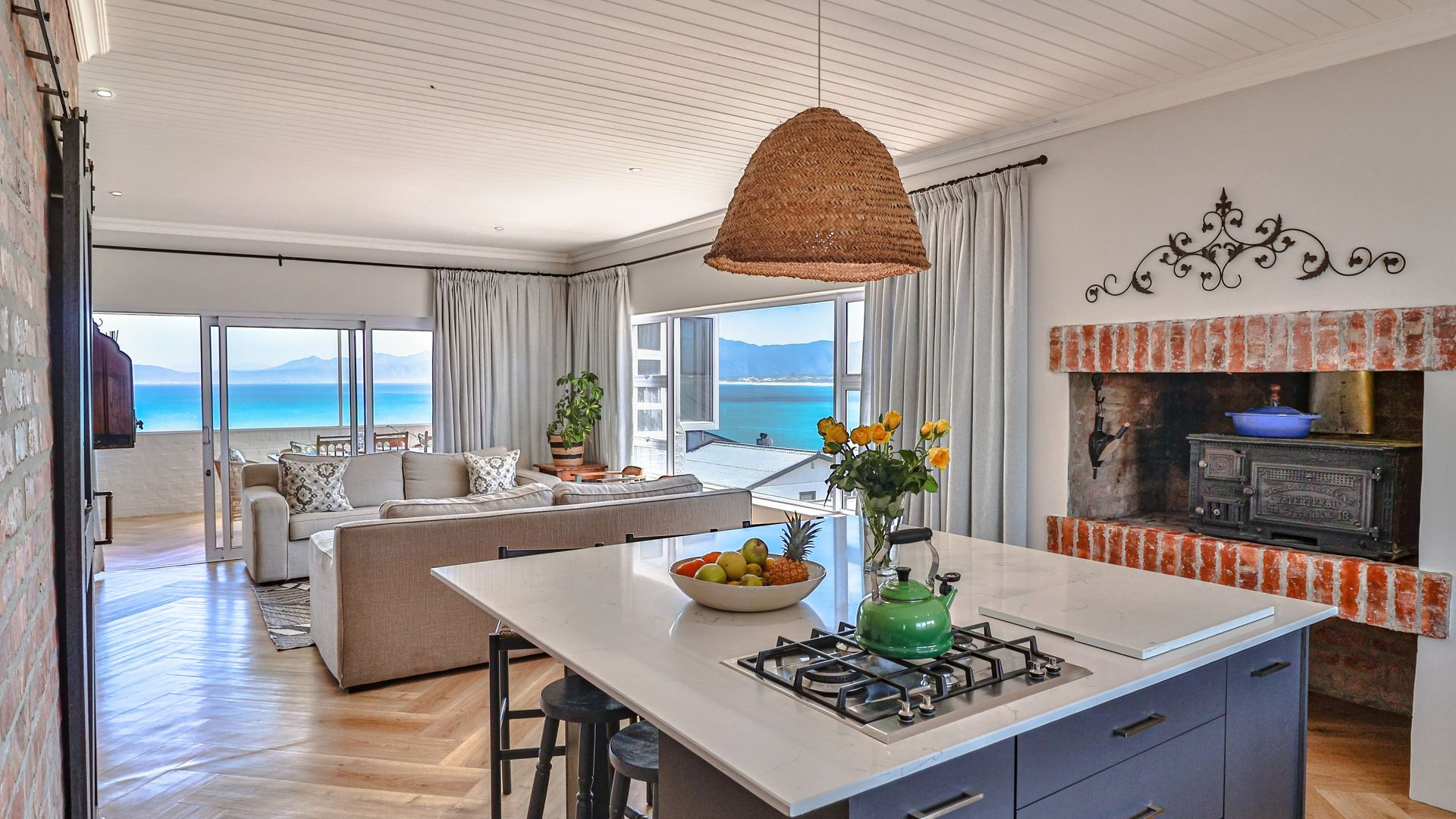 Upstairs, the first-floor highlight is the uninterrupted 180-degree ocean view from the entertaining area (with built-in braai), kitchen, and open-plan living room. The kitchen, centred around an island, features a gorgeous pantry, adjoining scullery, and includes a fireplace with a Dover stove, ensuring toasty winter nights. Two bedrooms share the first floor, of which the master suite is extra special, boasting a sea view, balcony, walk-in closet, and en-suite bathroom.