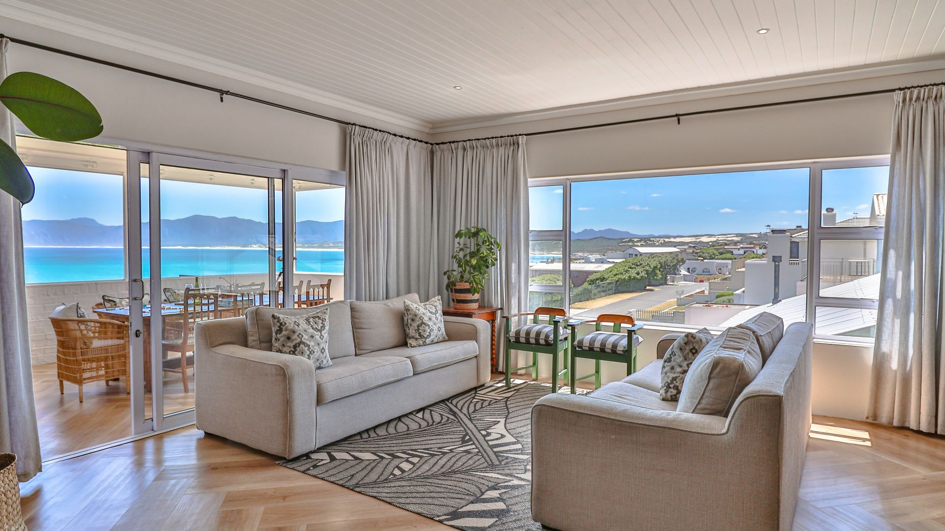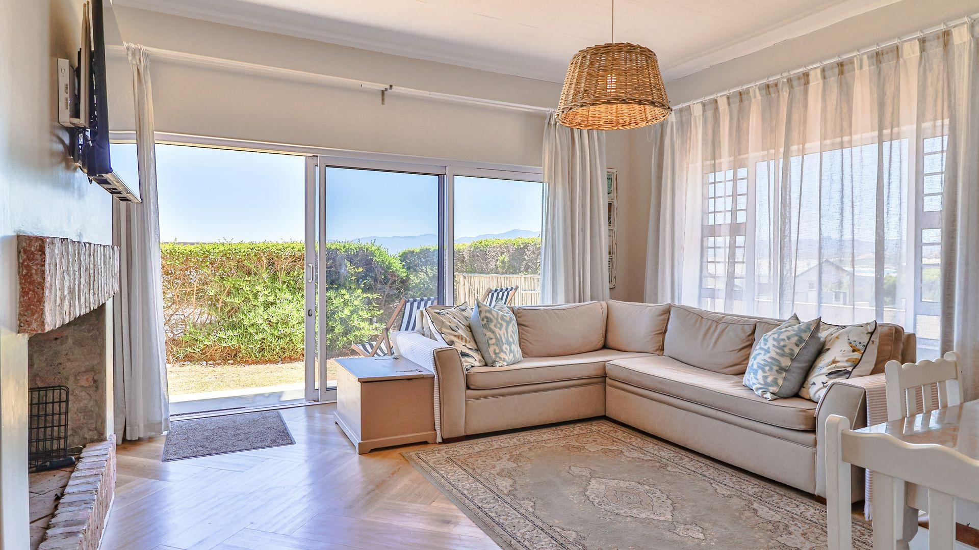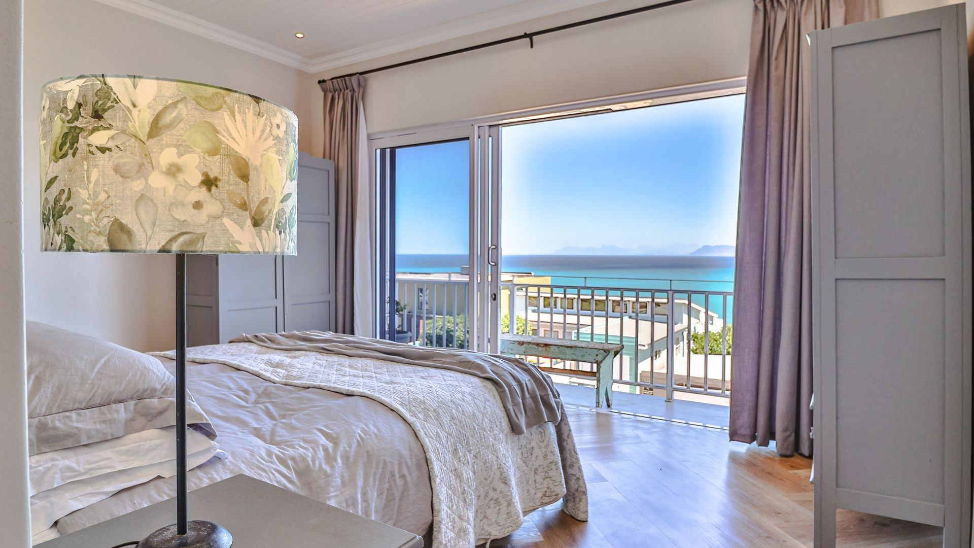 Upstairs, the first-floor highlight is the uninterrupted 180-degree ocean view from the entertaining area (with built-in braai), kitchen, and open-plan living room. The kitchen, centred around an island, features a gorgeous pantry, adjoining scullery, and includes a fireplace with a Dover stove, ensuring toasty winter nights. Two bedrooms share the first floor, of which the master suite is extra special, boasting a sea view, balcony, walk-in closet, and en-suite bathroom.