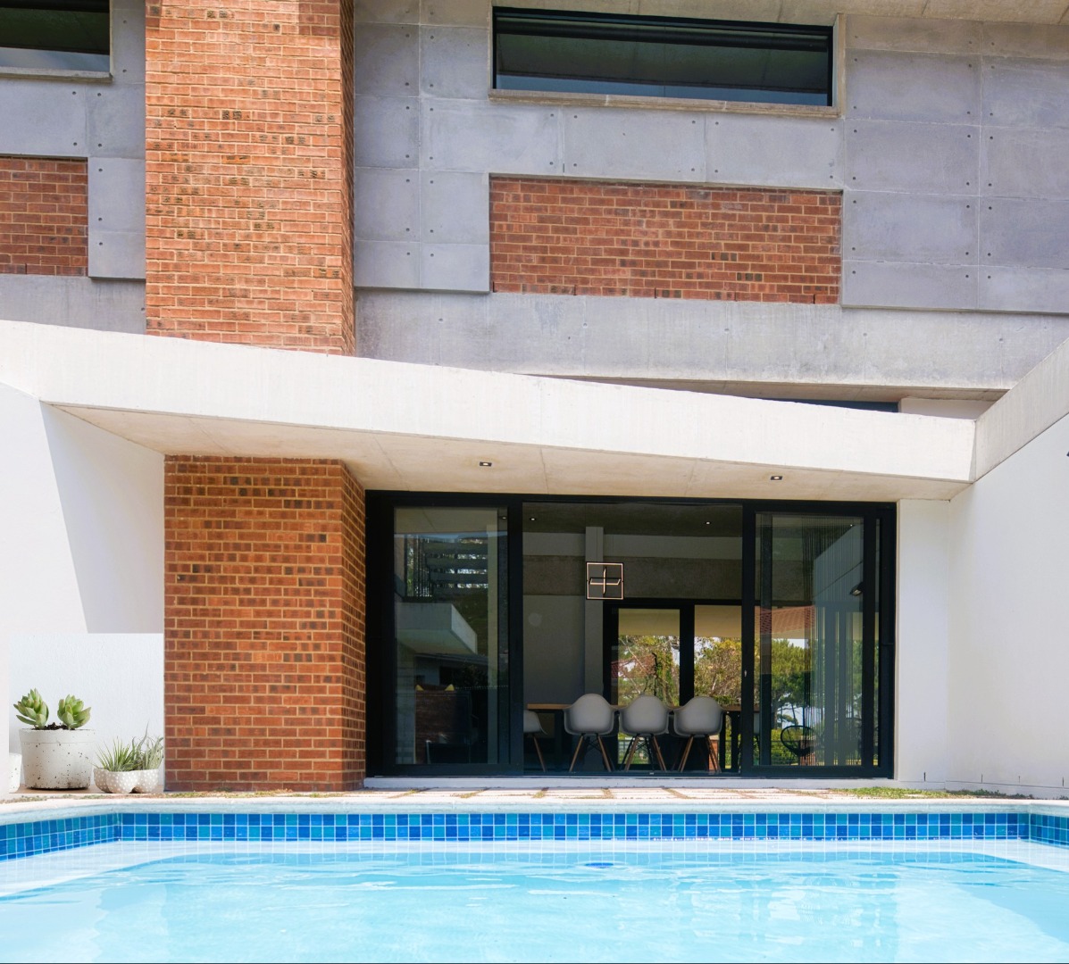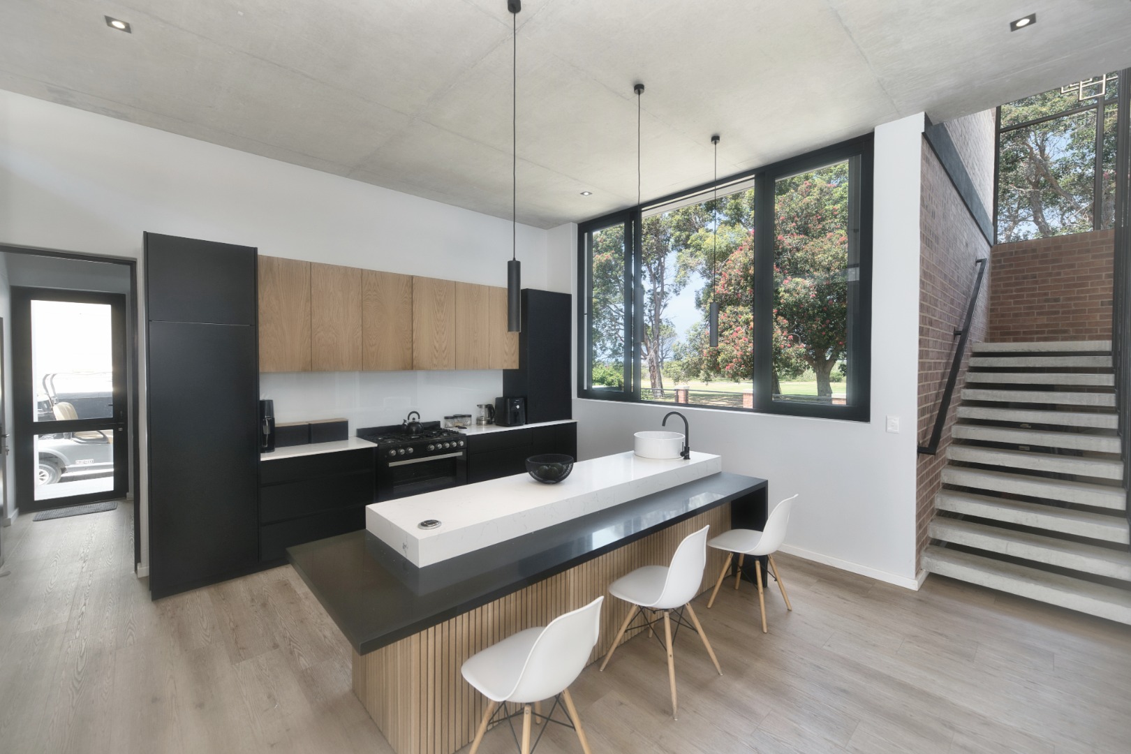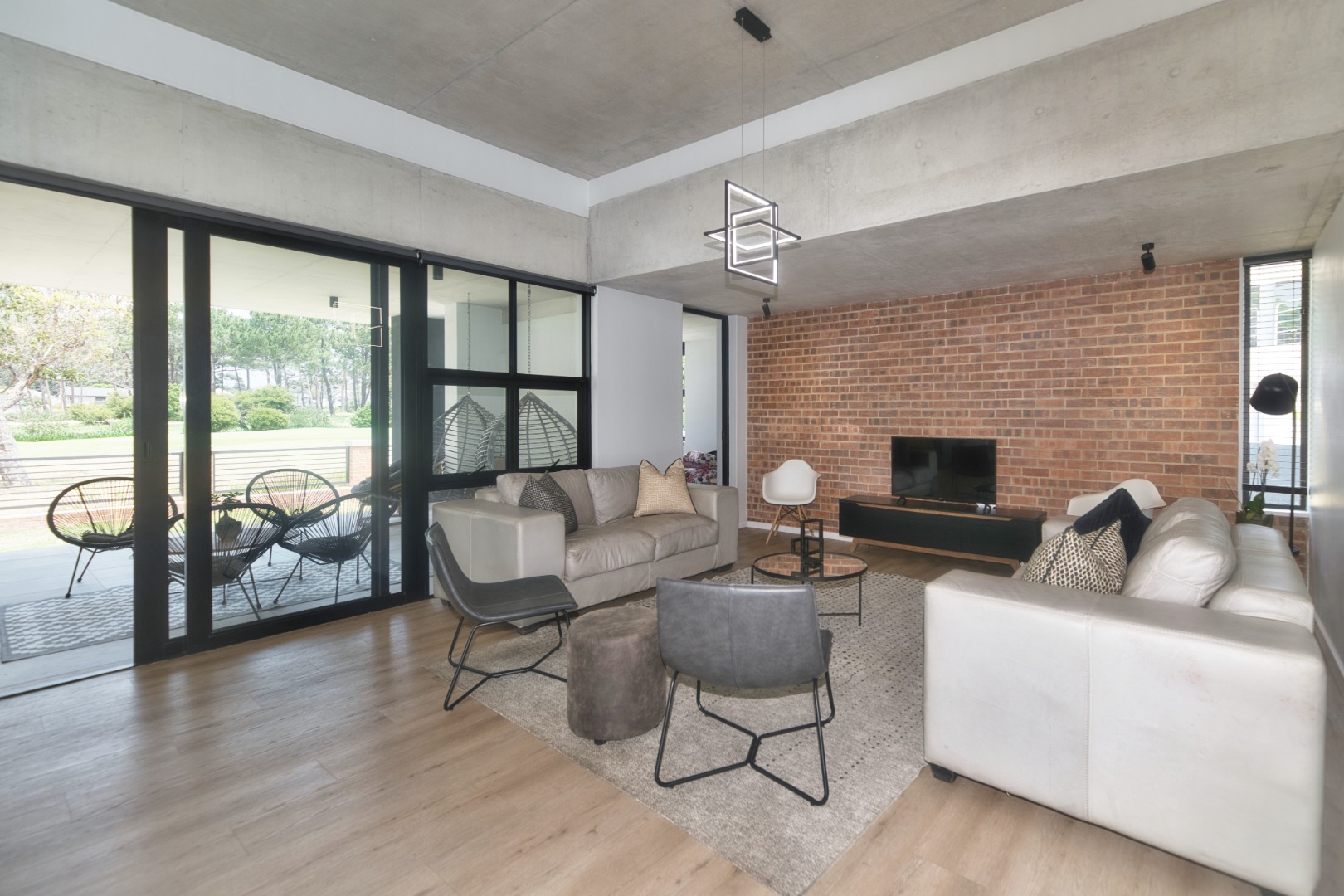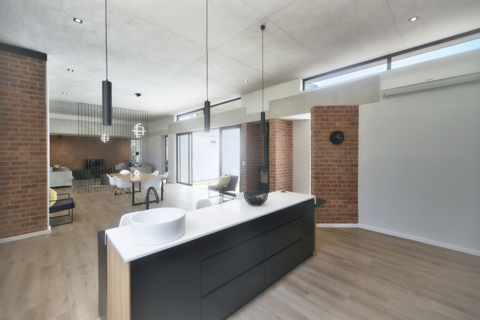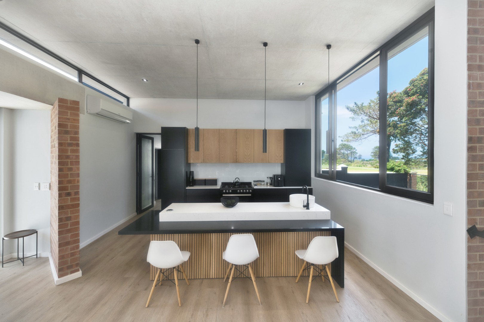 Once you walk in, its like an open-plan sanctuary, where exposed concrete ceilings and artfully placed brick accent walls create a distinctive aesthetic. The seamless flow between the lounge, dining area, and a contemporary kitchen, complete with a pantry and a stylish island, is enhanced by expansive sliding glass doors and windows. These special doors invite abundant natural light and effortlessly merge indoor luxury with the serene outdoor environment, perfect for entertaining or quiet contemplation.