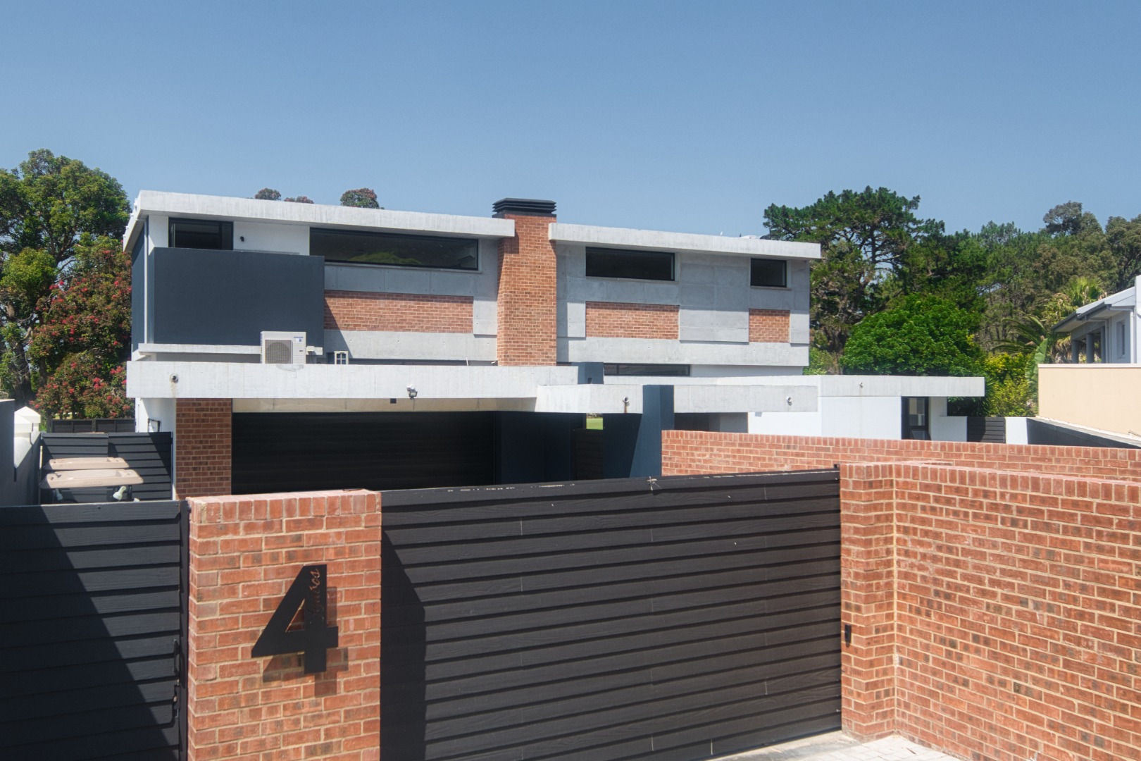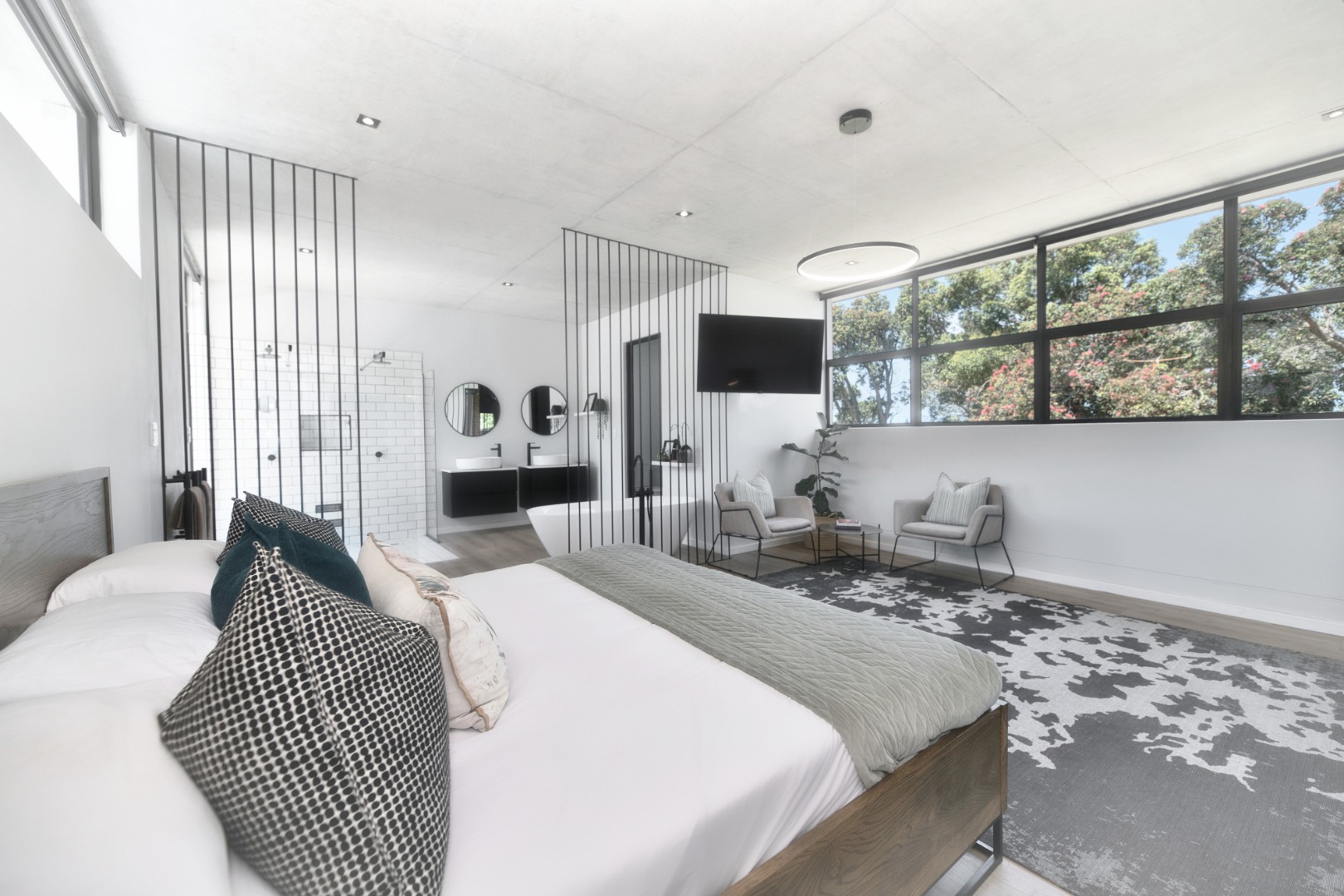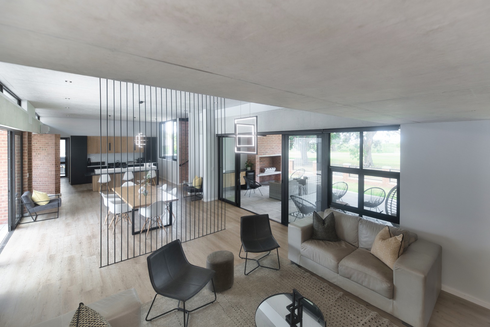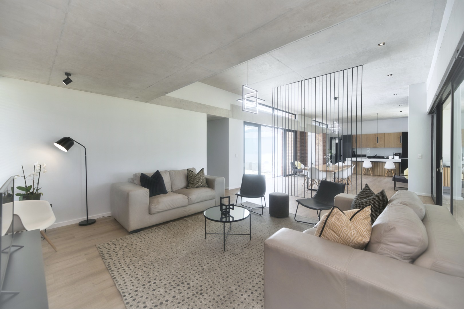 Once you walk in, its like an open-plan sanctuary, where exposed concrete ceilings and artfully placed brick accent walls create a distinctive aesthetic. The seamless flow between the lounge, dining area, and a contemporary kitchen, complete with a pantry and a stylish island, is enhanced by expansive sliding glass doors and windows. These special doors invite abundant natural light and effortlessly merge indoor luxury with the serene outdoor environment, perfect for entertaining or quiet contemplation.