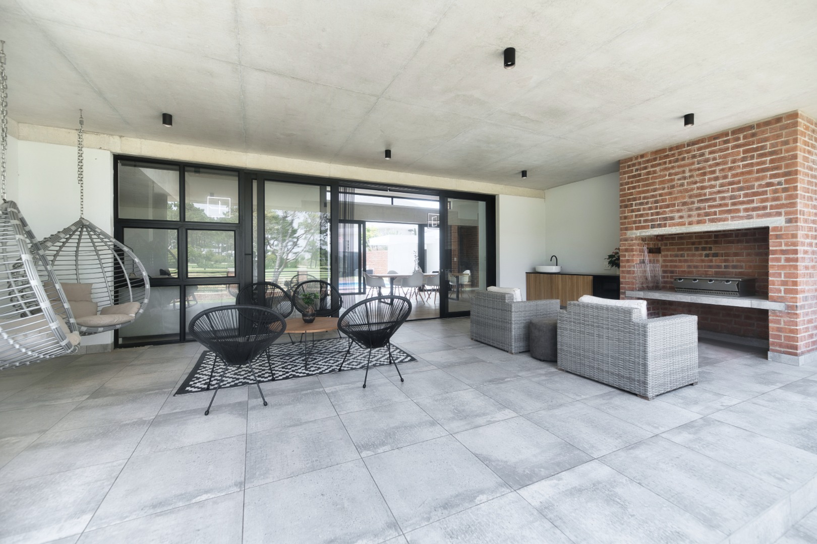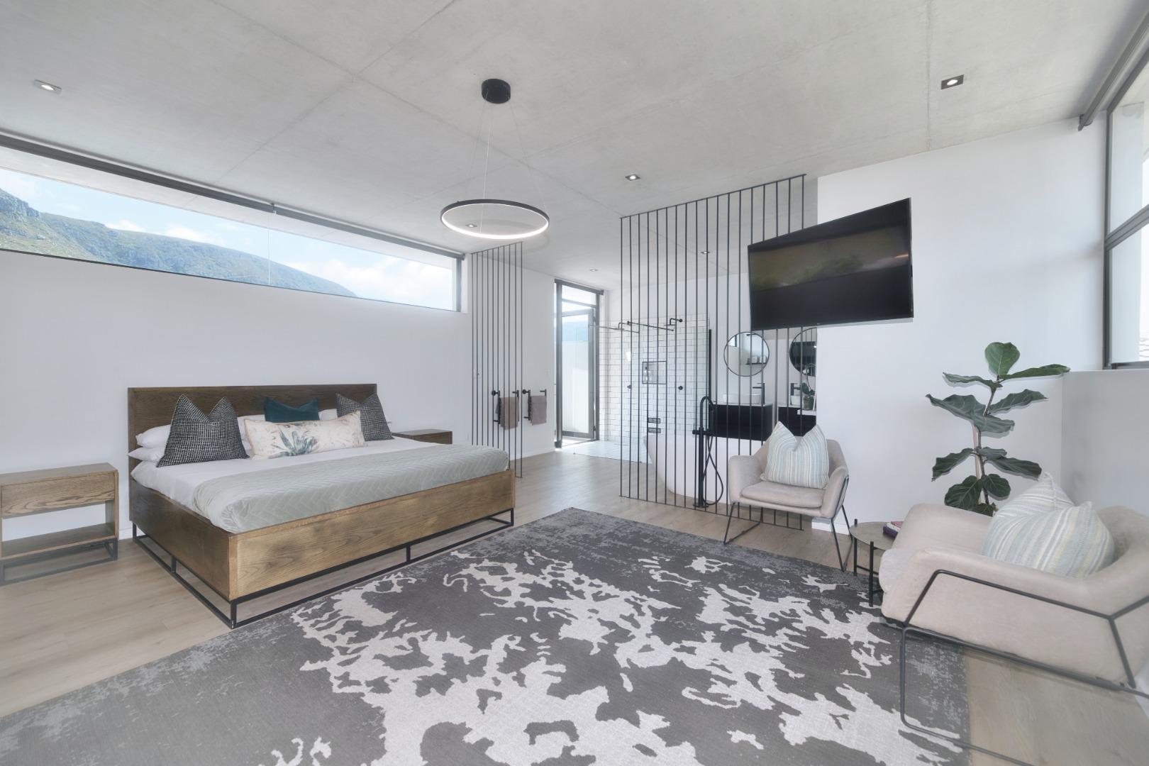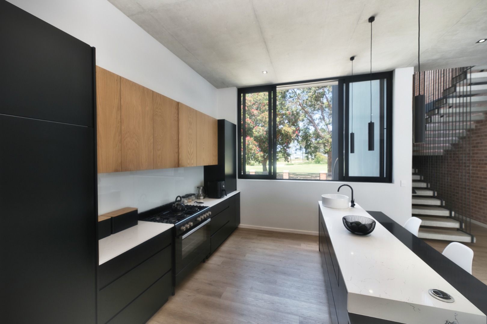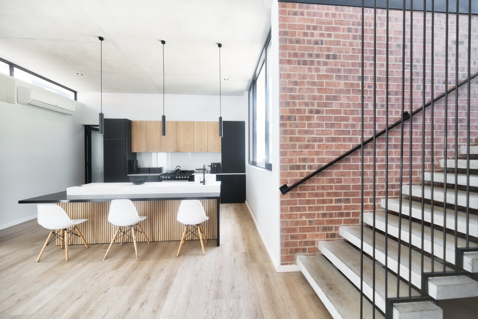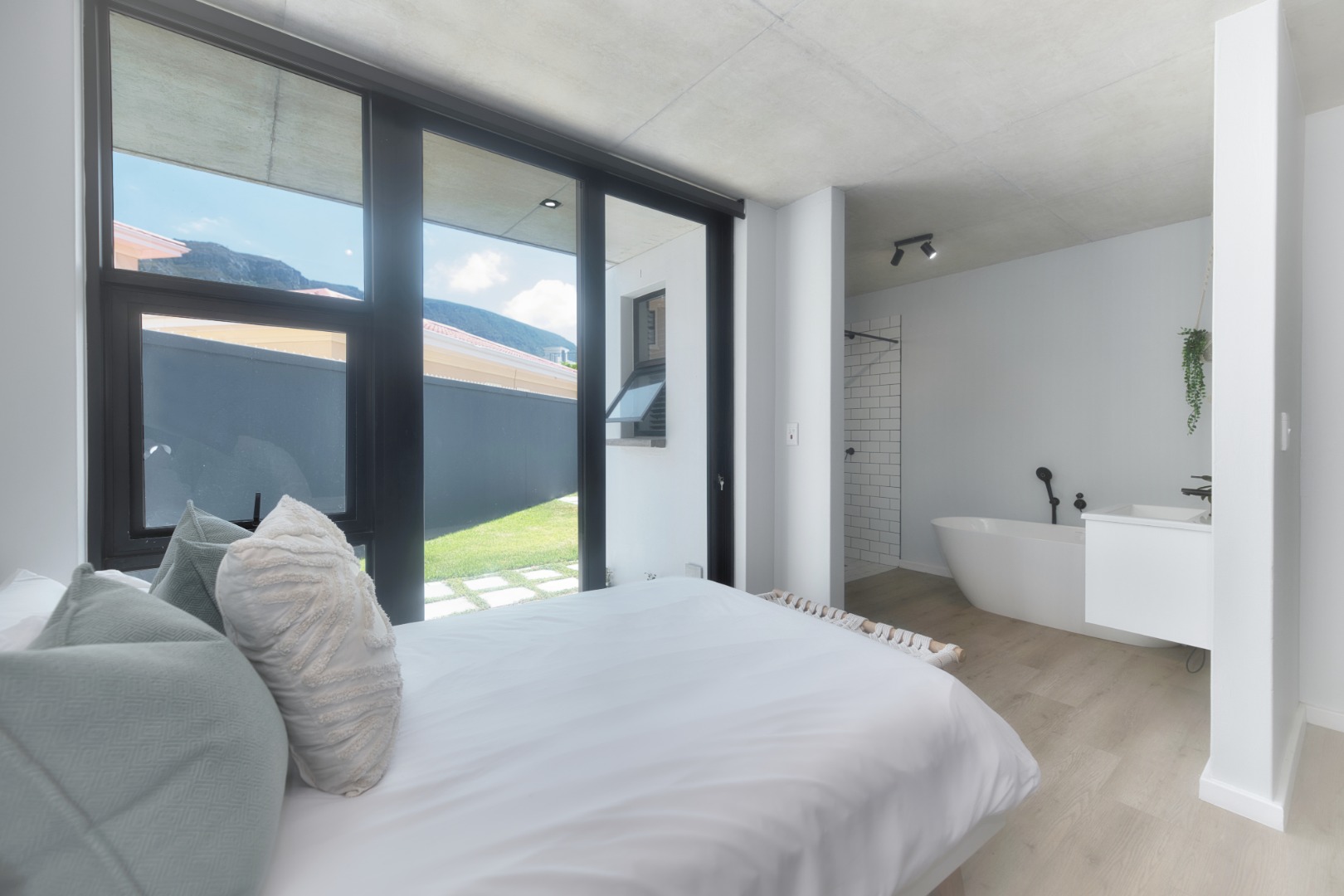 Once you walk in, its like an open-plan sanctuary, where exposed concrete ceilings and artfully placed brick accent walls create a distinctive aesthetic. The seamless flow between the lounge, dining area, and a contemporary kitchen, complete with a pantry and a stylish island, is enhanced by expansive sliding glass doors and windows. These special doors invite abundant natural light and effortlessly merge indoor luxury with the serene outdoor environment, perfect for entertaining or quiet contemplation.