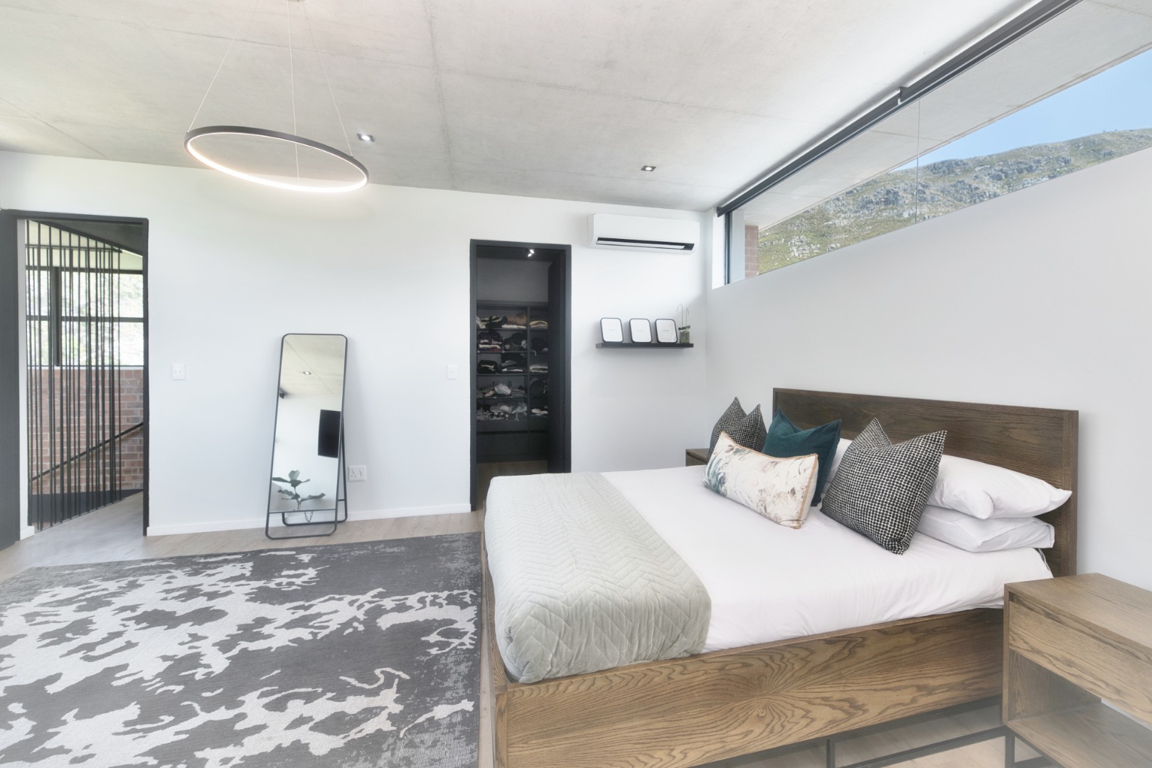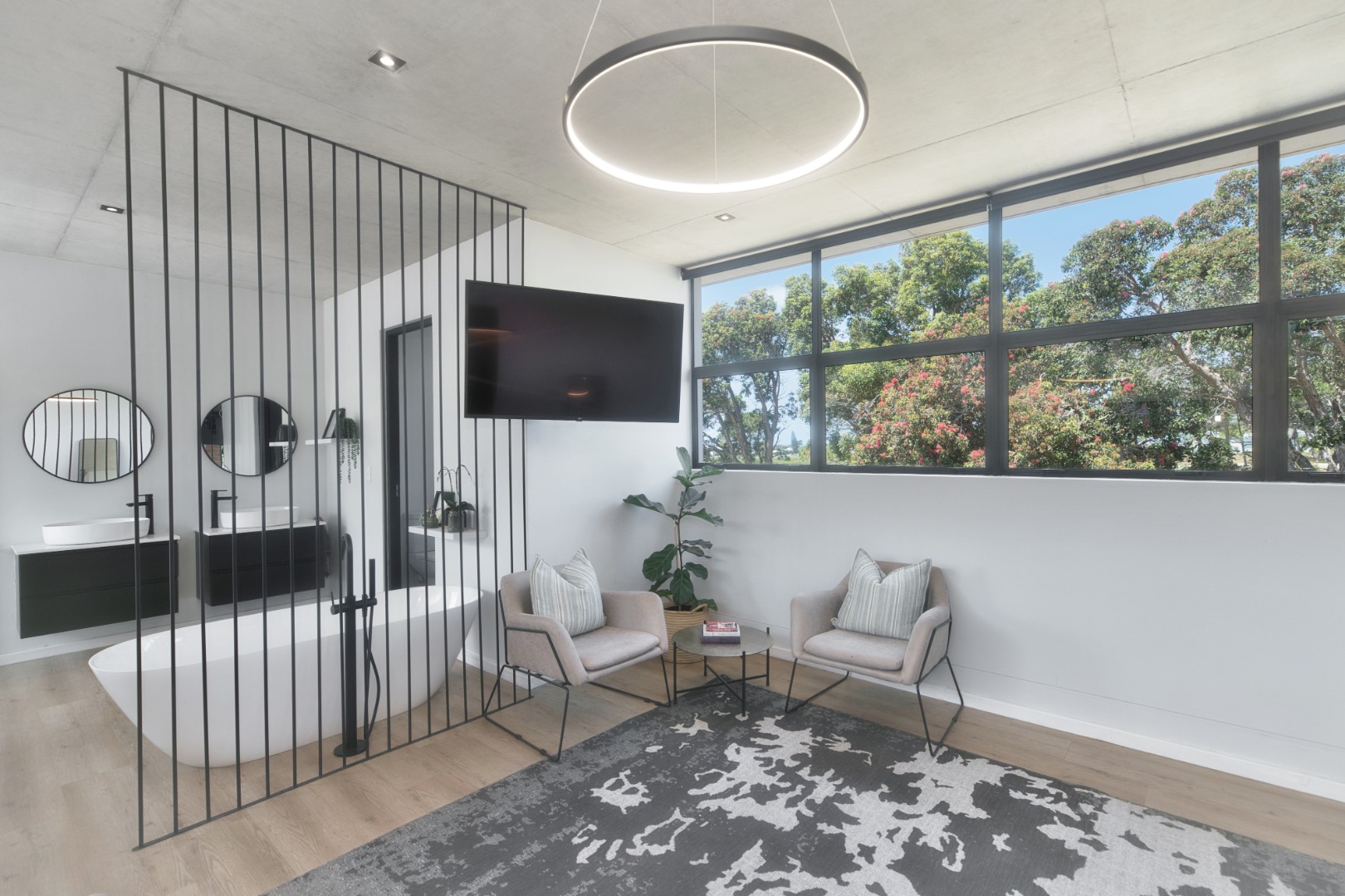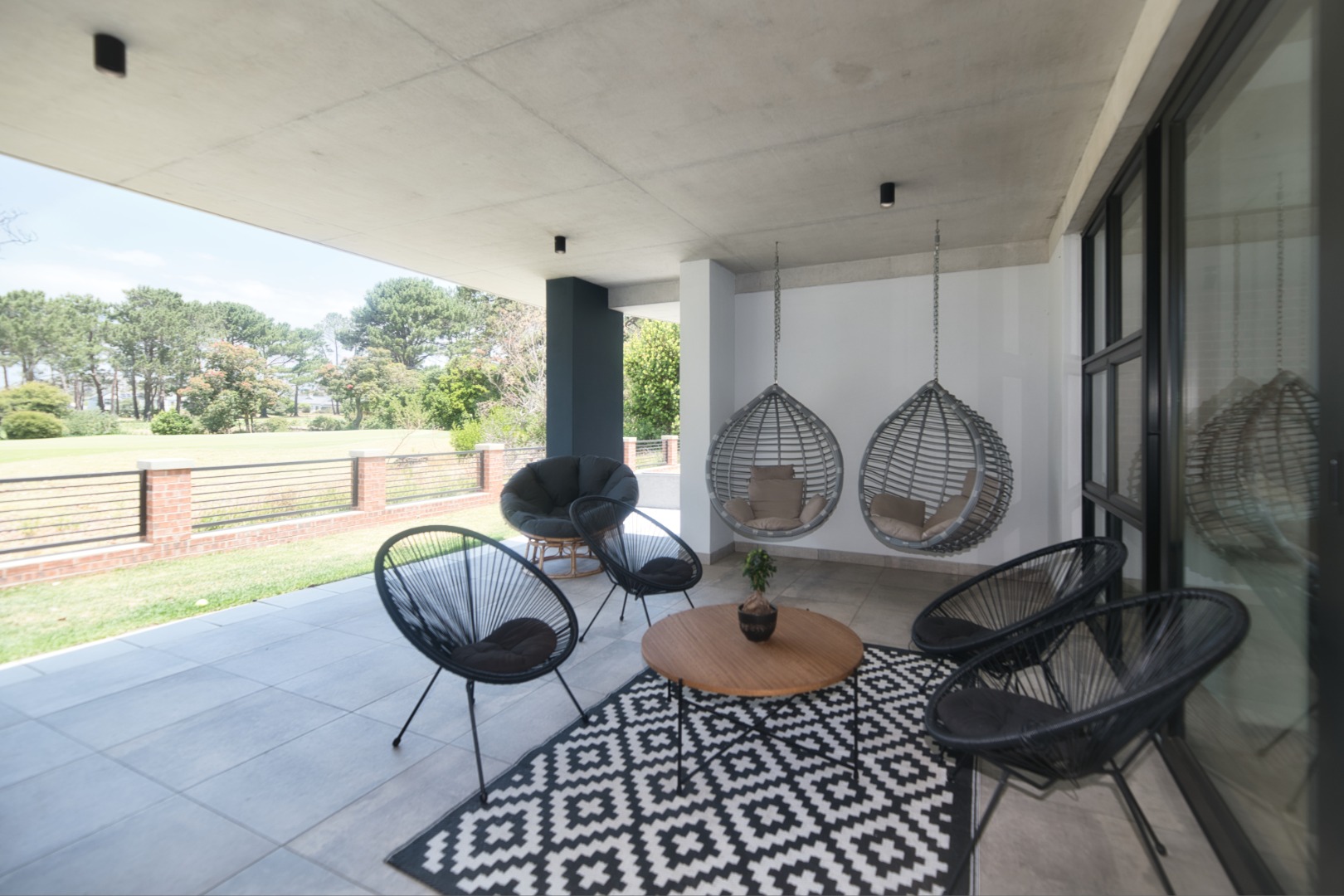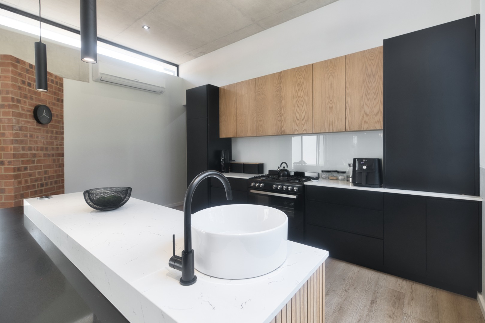 Once you walk in, its like an open-plan sanctuary, where exposed concrete ceilings and artfully placed brick accent walls create a distinctive aesthetic. The seamless flow between the lounge, dining area, and a contemporary kitchen, complete with a pantry and a stylish island, is enhanced by expansive sliding glass doors and windows. These special doors invite abundant natural light and effortlessly merge indoor luxury with the serene outdoor environment, perfect for entertaining or quiet contemplation.