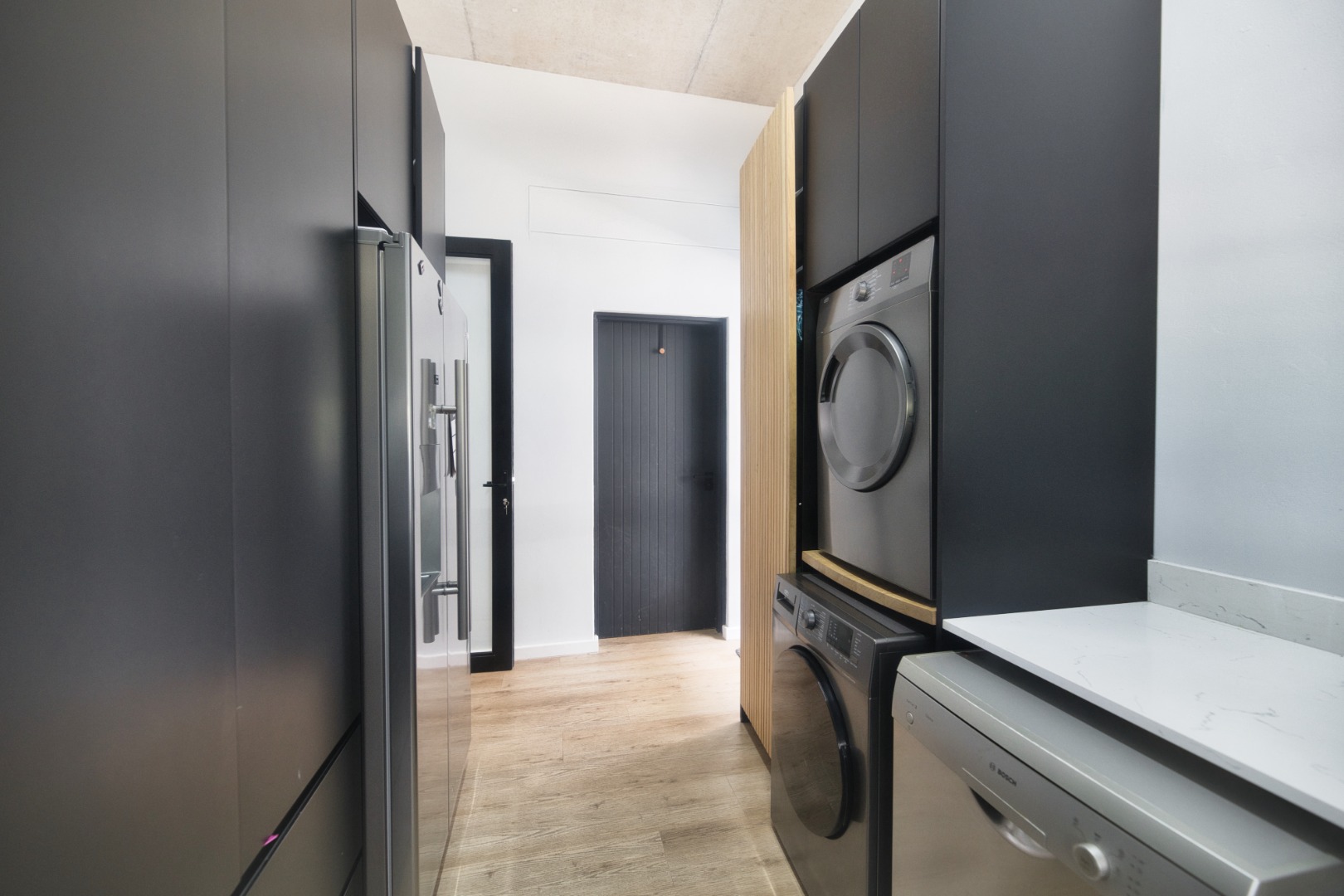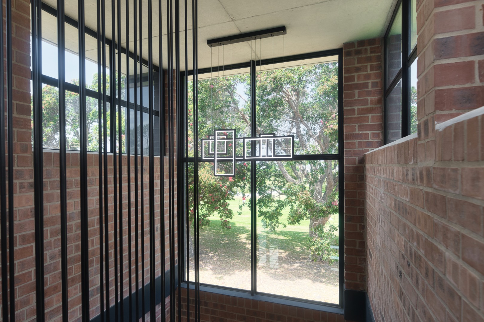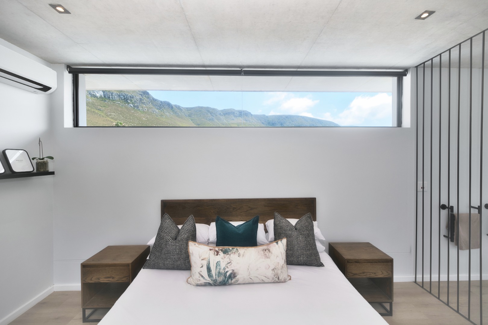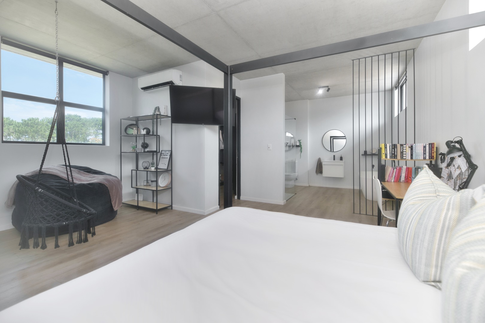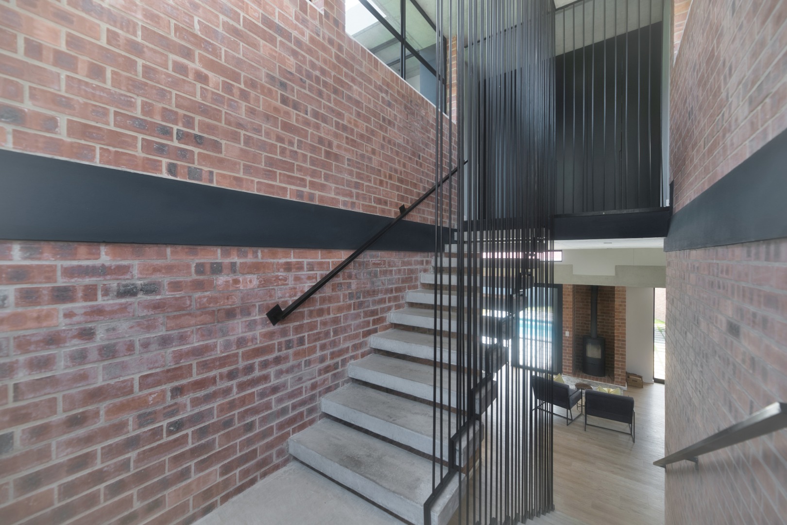 Once you walk in, its like an open-plan sanctuary, where exposed concrete ceilings and artfully placed brick accent walls create a distinctive aesthetic. The seamless flow between the lounge, dining area, and a contemporary kitchen, complete with a pantry and a stylish island, is enhanced by expansive sliding glass doors and windows. These special doors invite abundant natural light and effortlessly merge indoor luxury with the serene outdoor environment, perfect for entertaining or quiet contemplation.