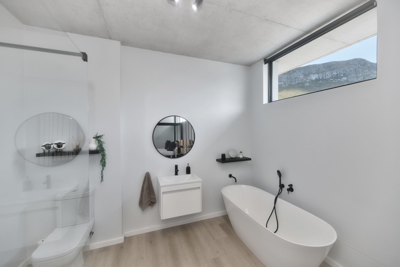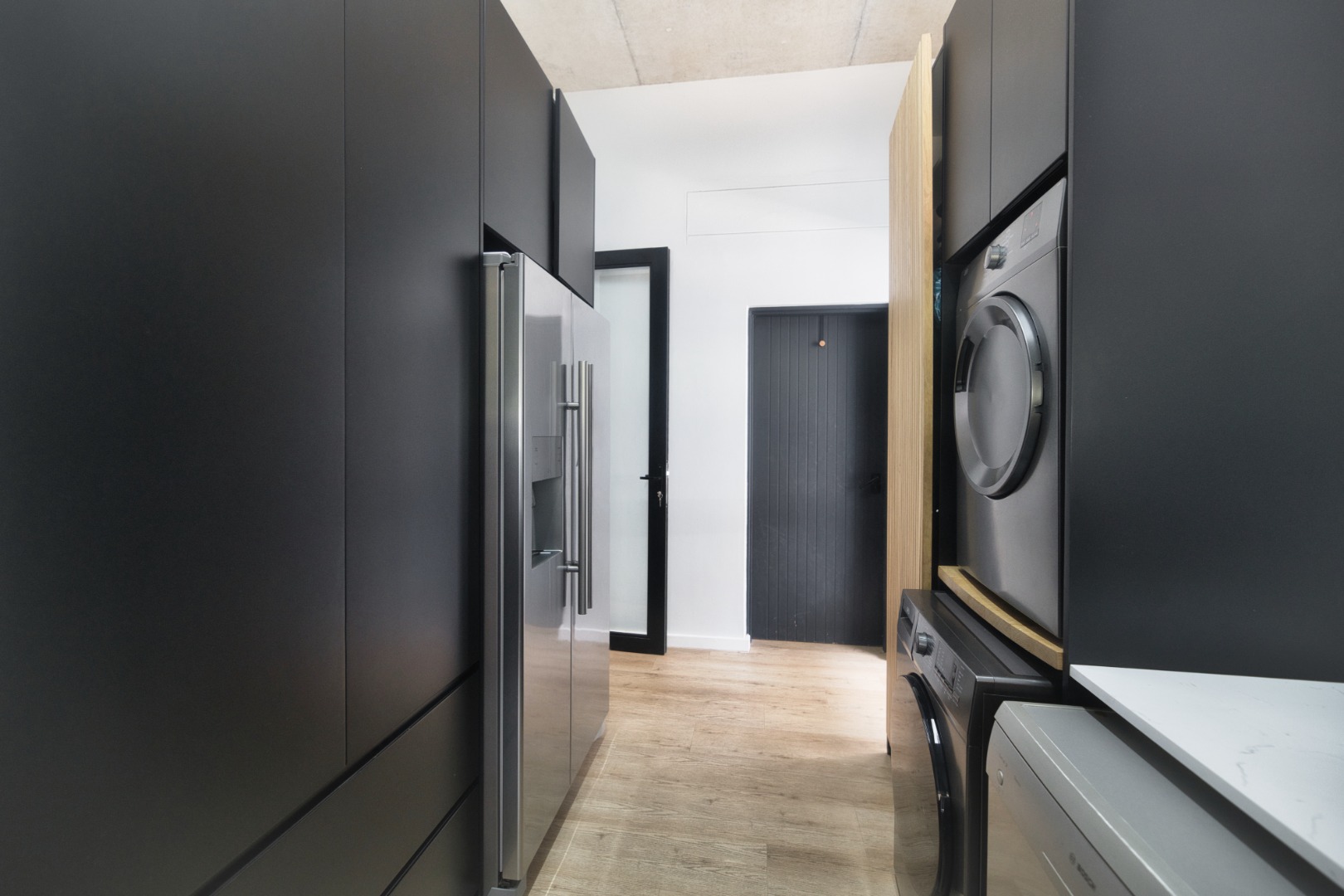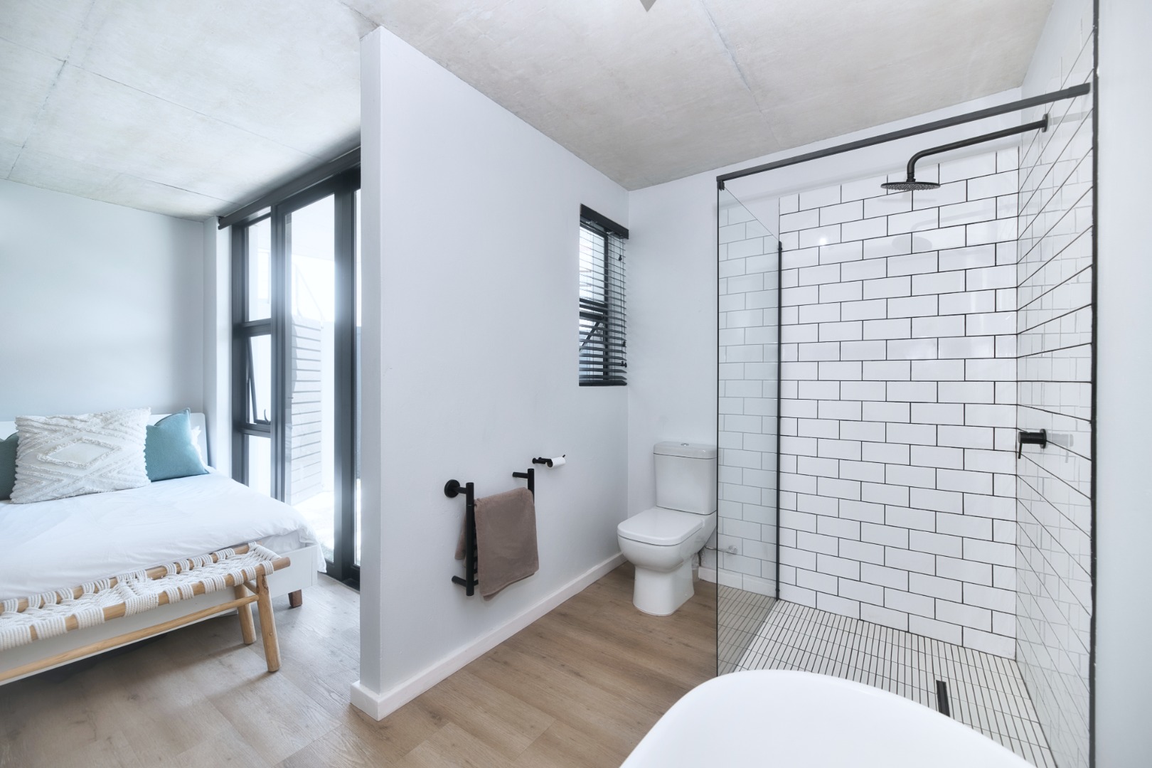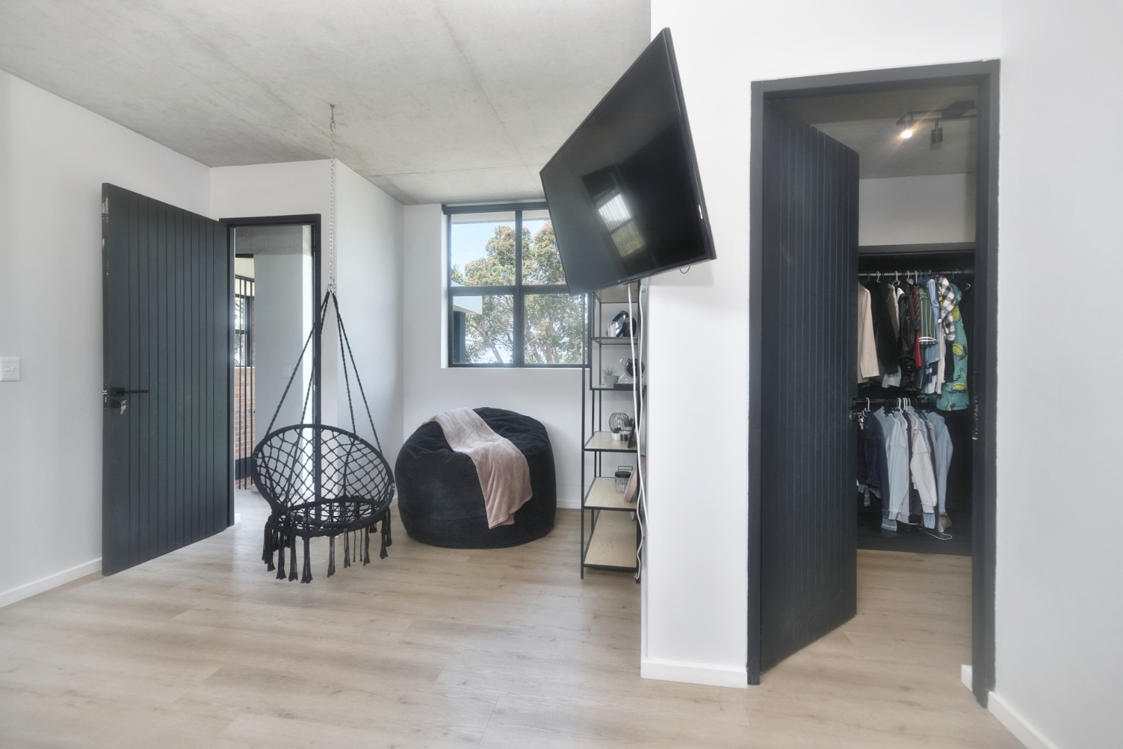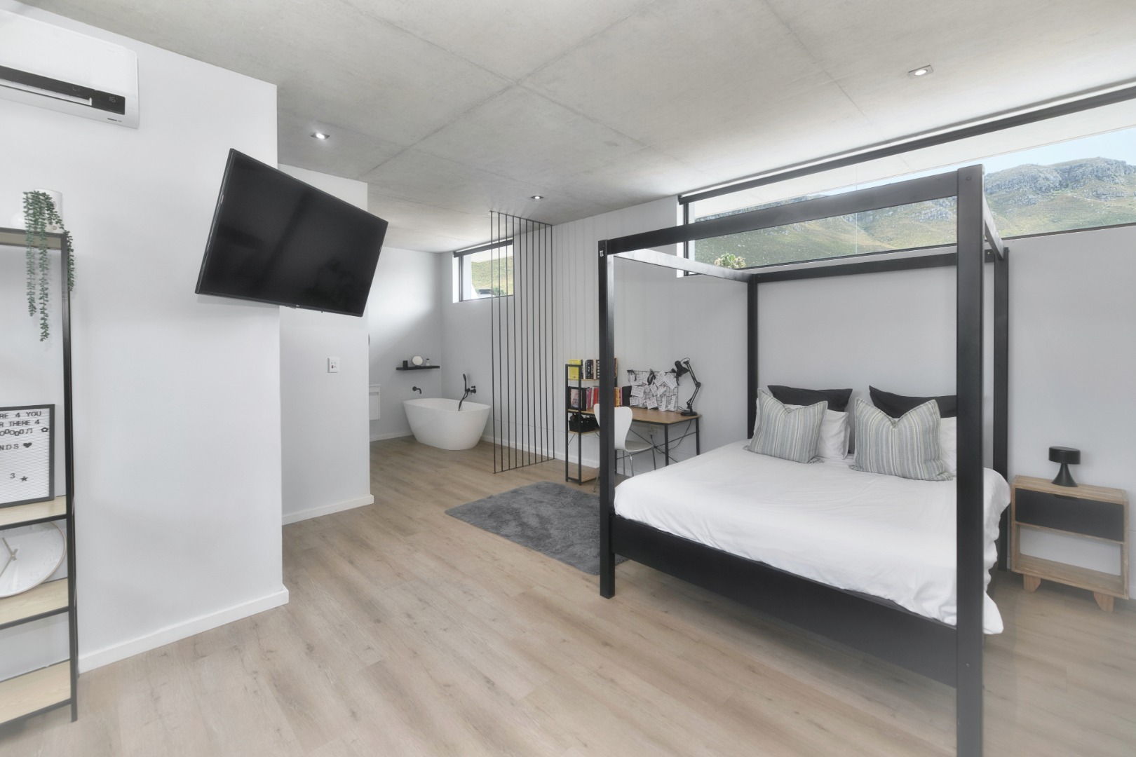 Once you walk in, its like an open-plan sanctuary, where exposed concrete ceilings and artfully placed brick accent walls create a distinctive aesthetic. The seamless flow between the lounge, dining area, and a contemporary kitchen, complete with a pantry and a stylish island, is enhanced by expansive sliding glass doors and windows. These special doors invite abundant natural light and effortlessly merge indoor luxury with the serene outdoor environment, perfect for entertaining or quiet contemplation.