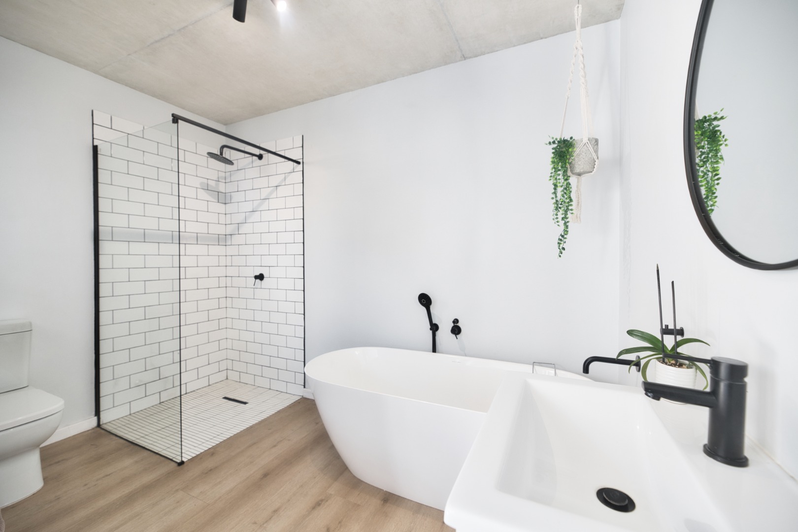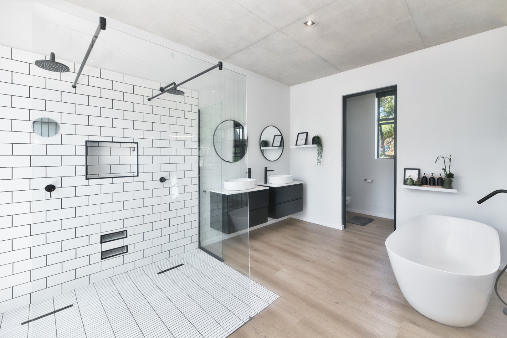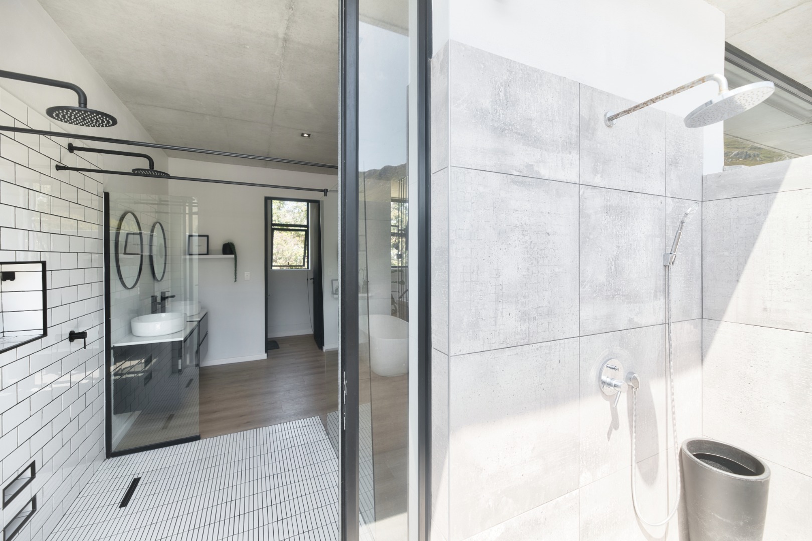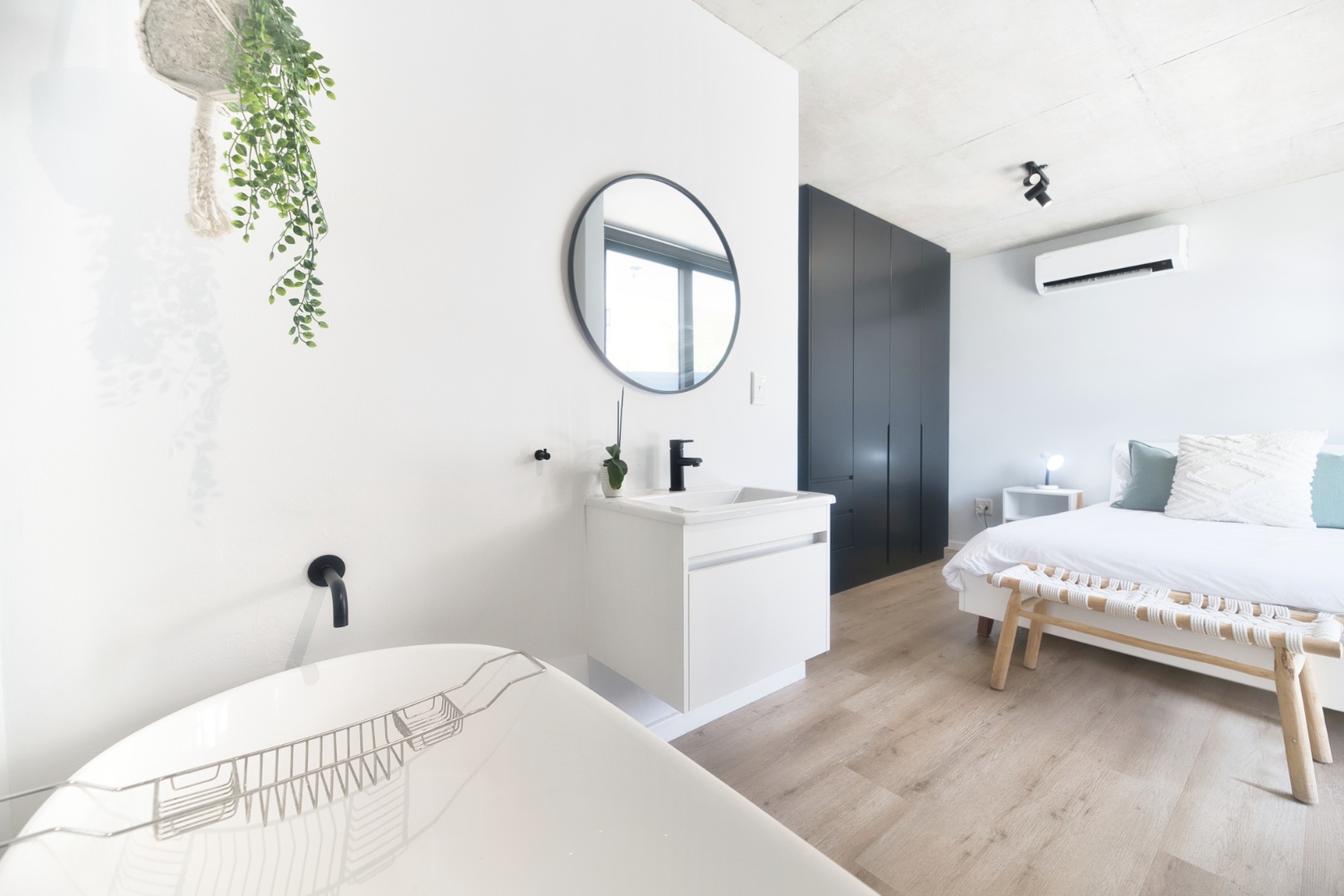 Once you walk in, its like an open-plan sanctuary, where exposed concrete ceilings and artfully placed brick accent walls create a distinctive aesthetic. The seamless flow between the lounge, dining area, and a contemporary kitchen, complete with a pantry and a stylish island, is enhanced by expansive sliding glass doors and windows. These special doors invite abundant natural light and effortlessly merge indoor luxury with the serene outdoor environment, perfect for entertaining or quiet contemplation.