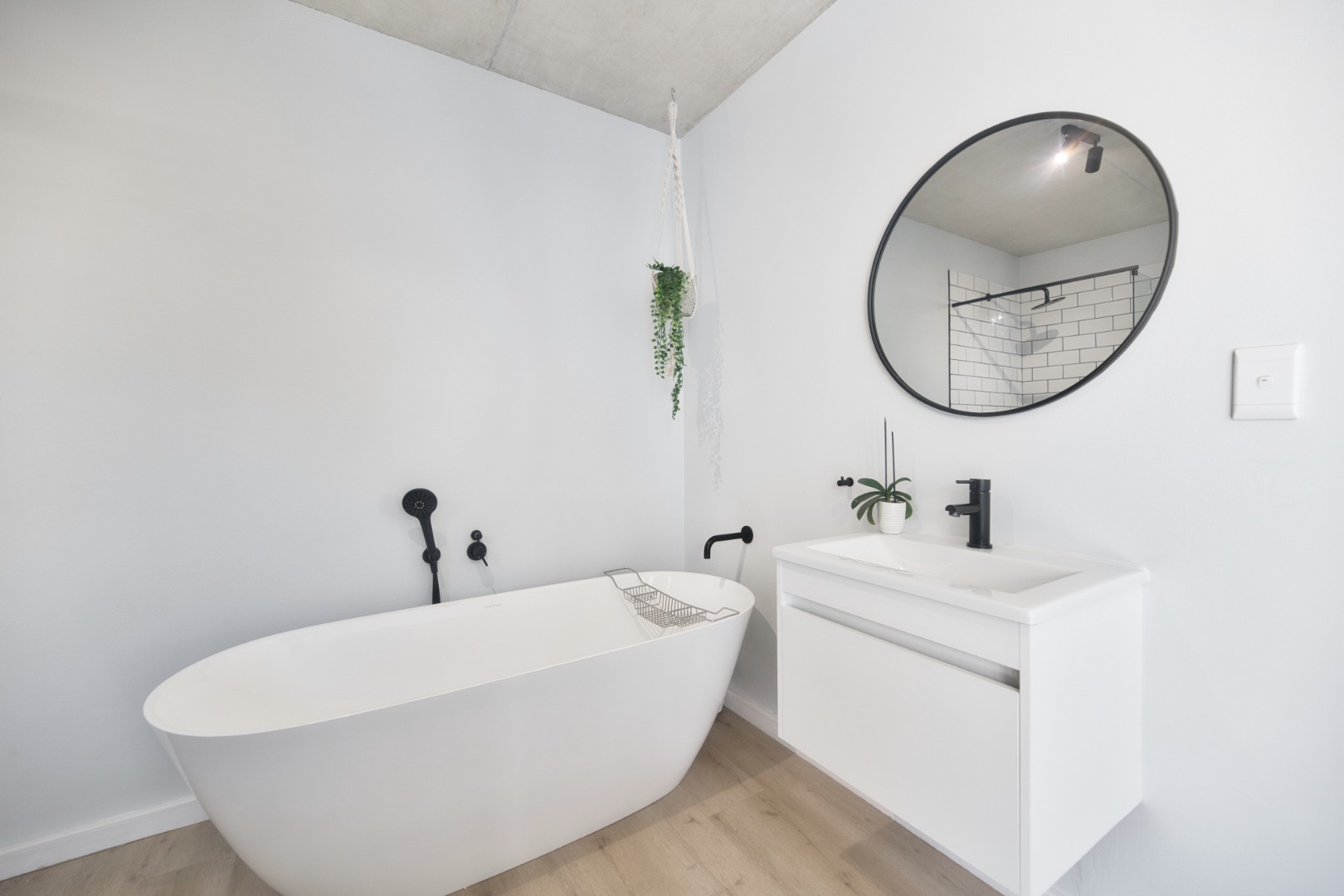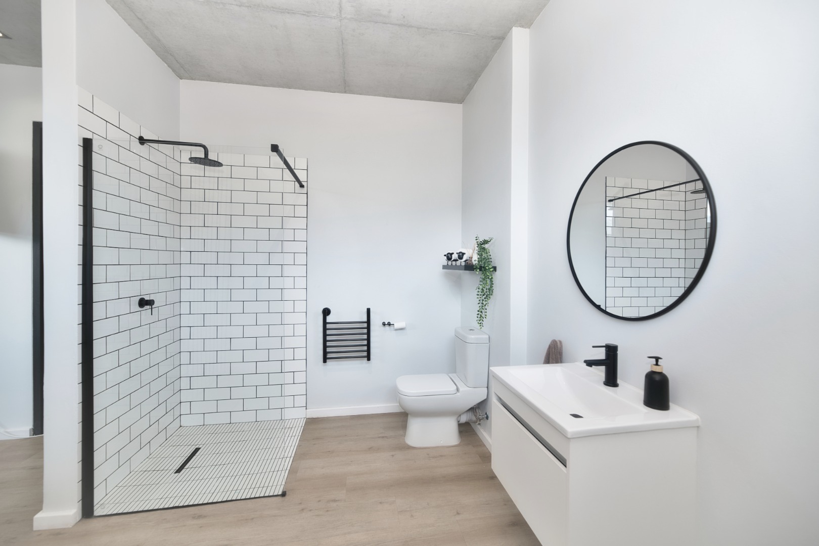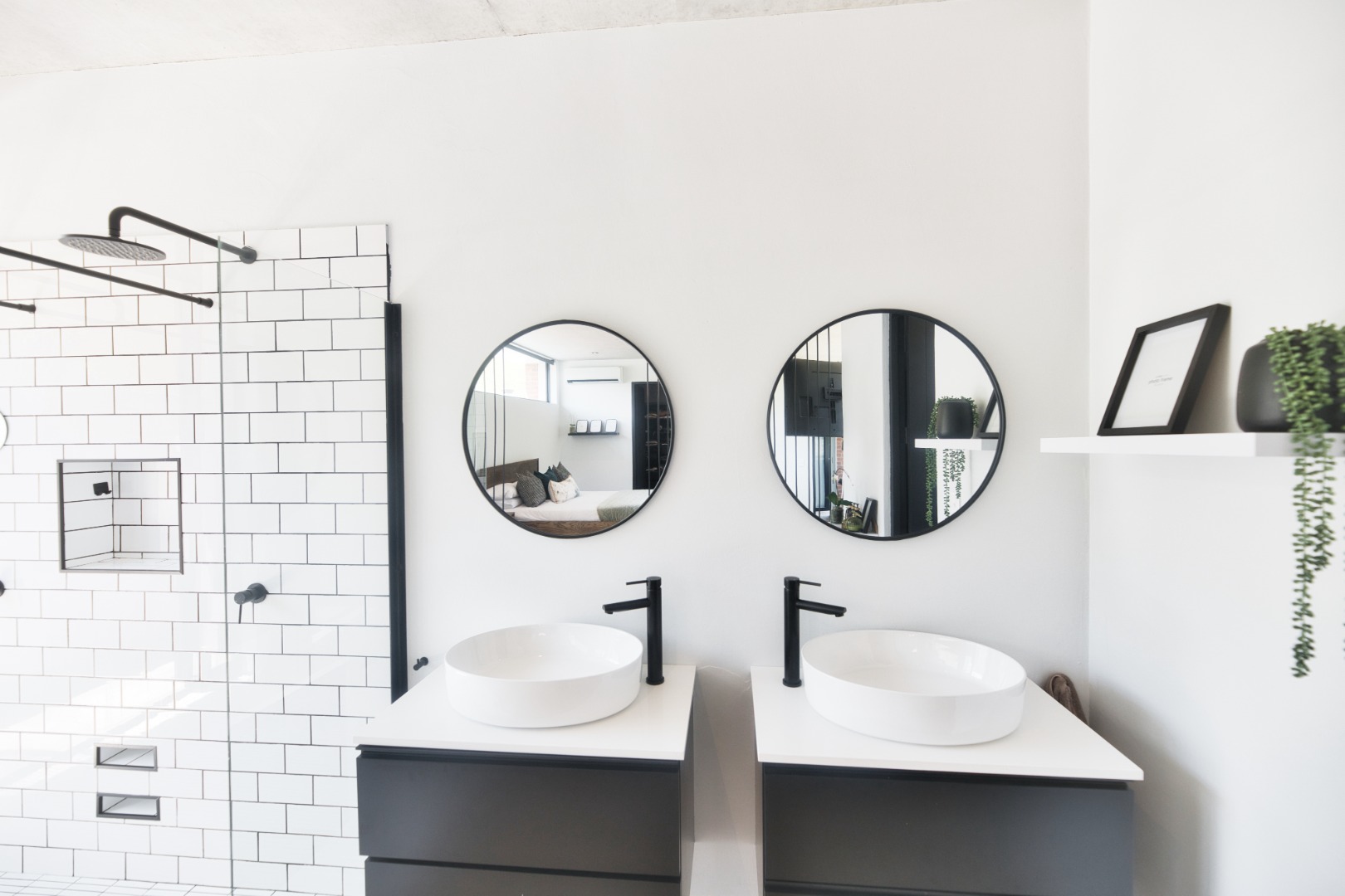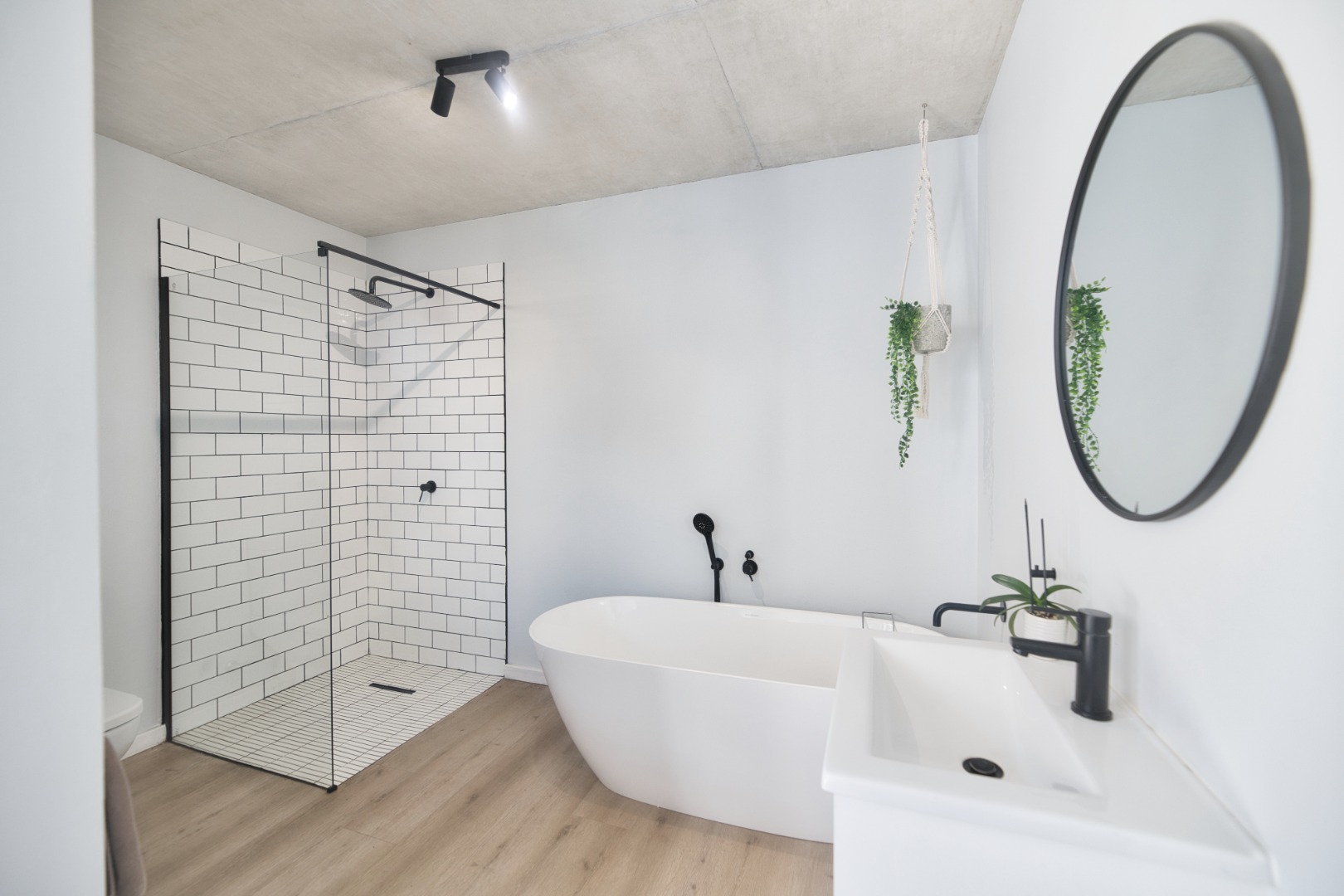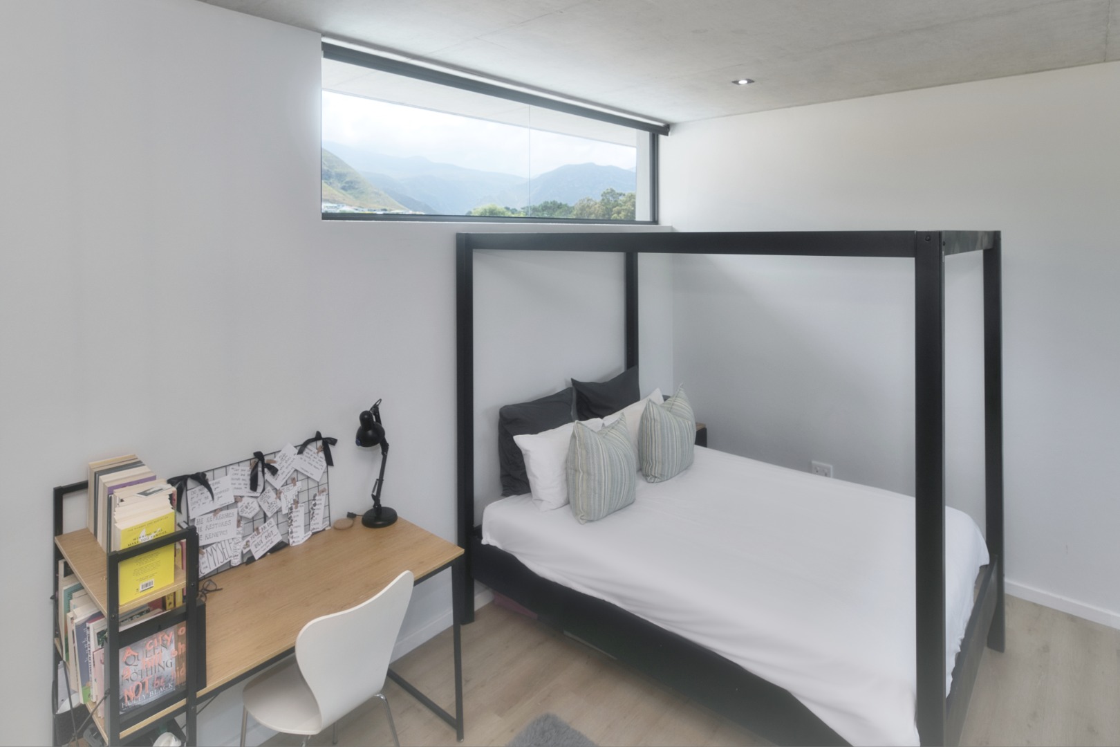 Once you walk in, its like an open-plan sanctuary, where exposed concrete ceilings and artfully placed brick accent walls create a distinctive aesthetic. The seamless flow between the lounge, dining area, and a contemporary kitchen, complete with a pantry and a stylish island, is enhanced by expansive sliding glass doors and windows. These special doors invite abundant natural light and effortlessly merge indoor luxury with the serene outdoor environment, perfect for entertaining or quiet contemplation.