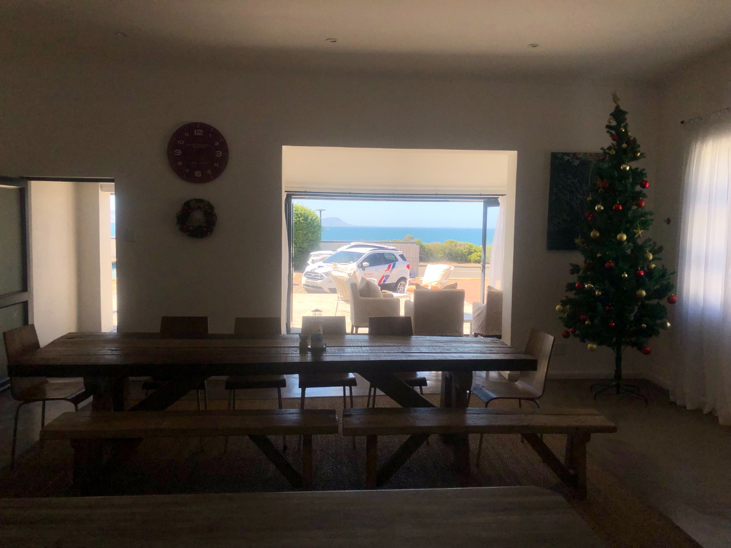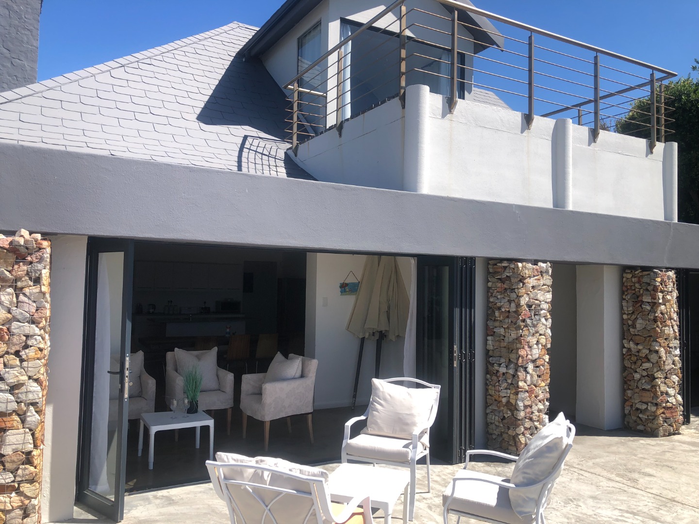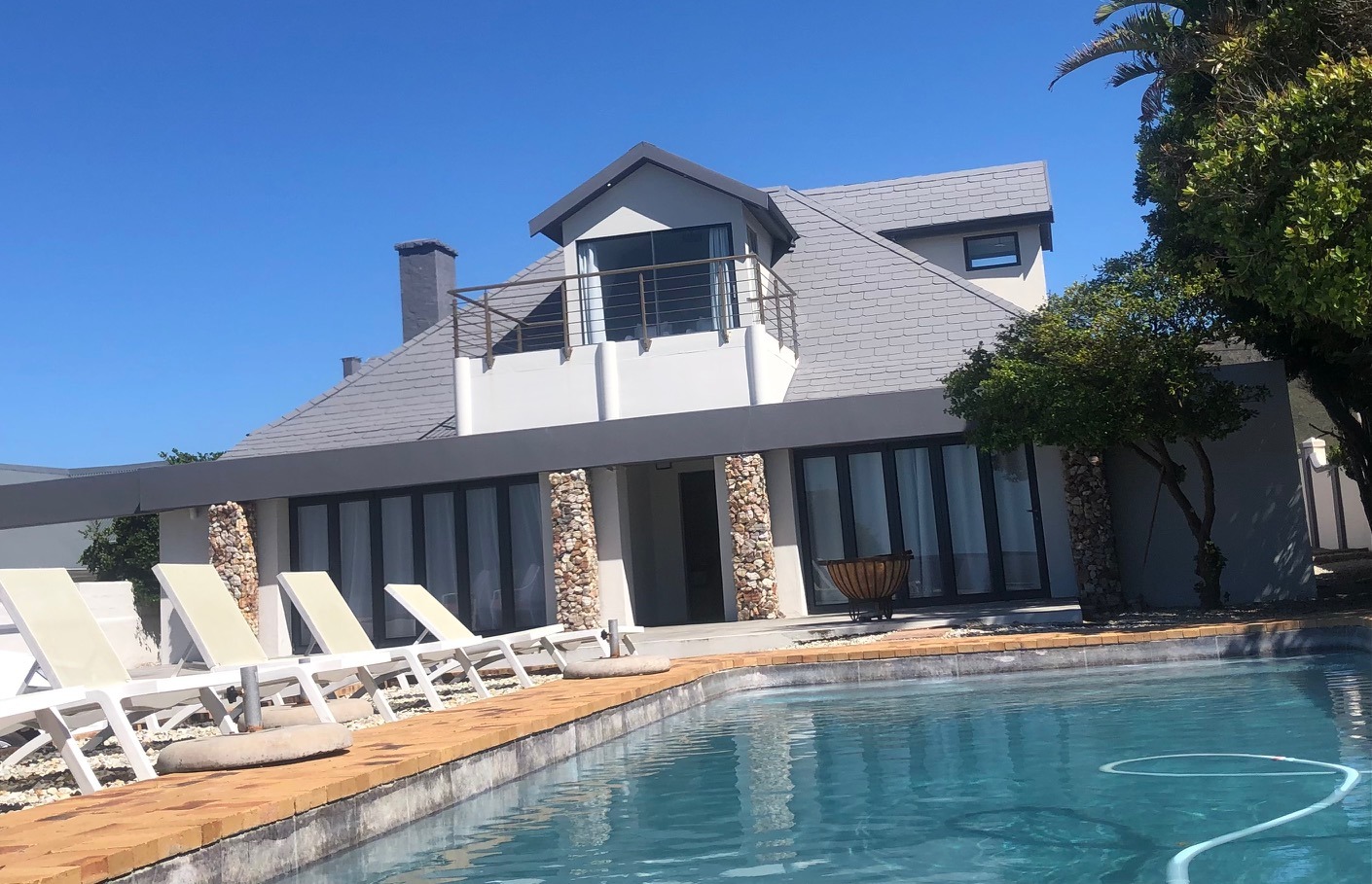 The outdoor spaces are a true highlight, designed for relaxation and entertainment. A private swimming pool, complete with sun loungers, offers a refreshing escape while enjoying the sea breeze. Multiple spacious patios provide versatile areas for those love sunset evenings, lounging, and social gatherings, complete with a built-in braai and fire pit for memorable evenings. Lush coastal landscaping surrounds the property, enhancing its natural beauty. Practical amenities include a double garage and ample additional parking for up to seven vehicles on a paved driveway, all within a totally walled perimeter.