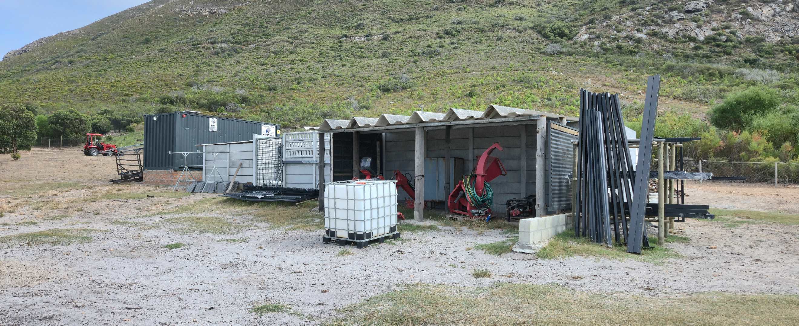 Infrastructure includes three equipment stores, feed storage, horse stalls, a caravan for farm manager accommodation, and an off-grid cabin with braai area, swimming pool, and bar. The cabin is secured with clear-view fencing, and seven surveillance cameras provide added peace of mind. The sale includes a tractor and farm equipment, allowing immediate use of the land.