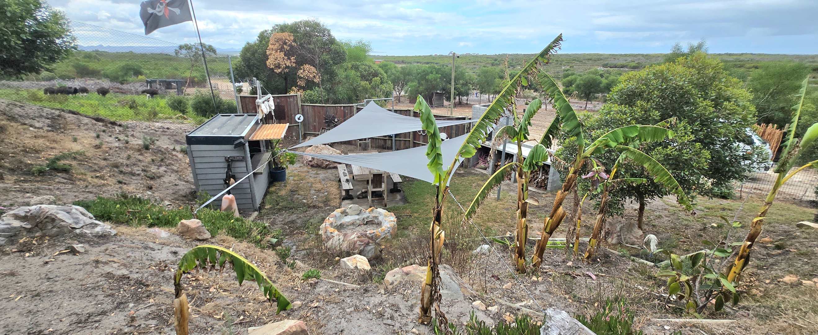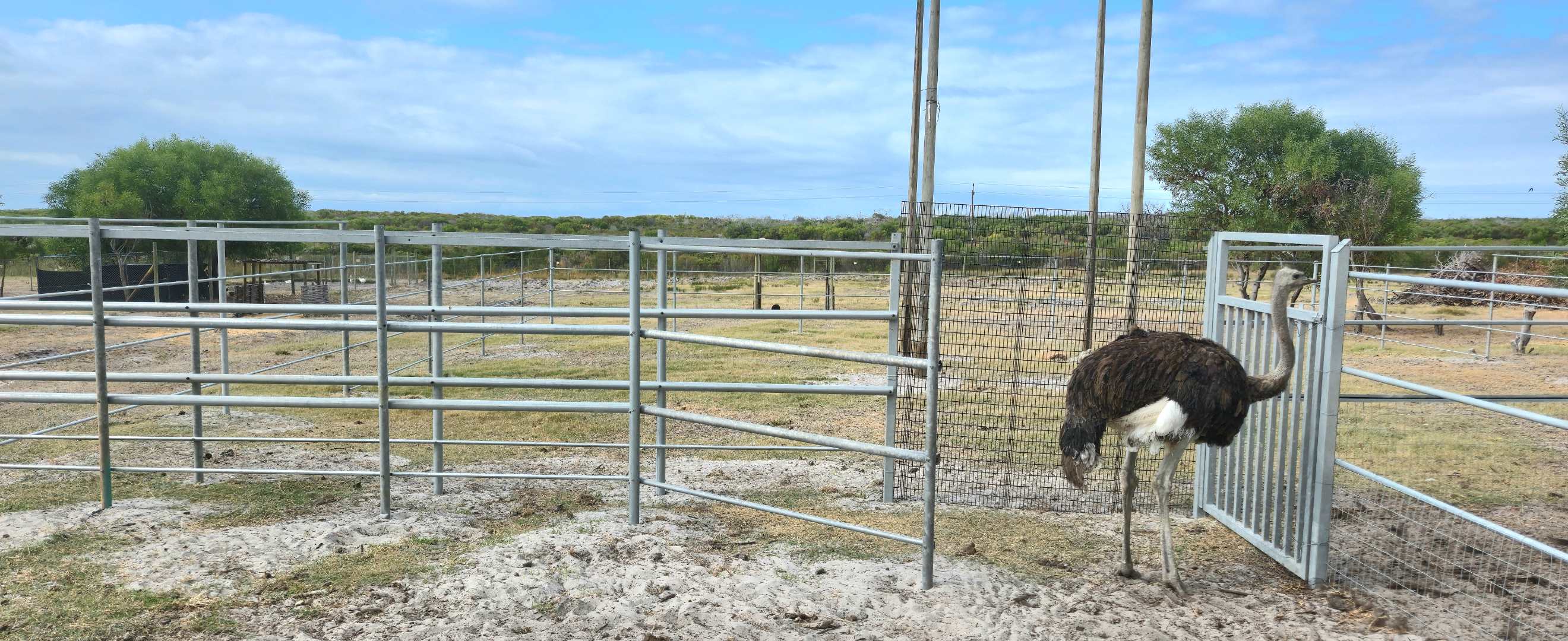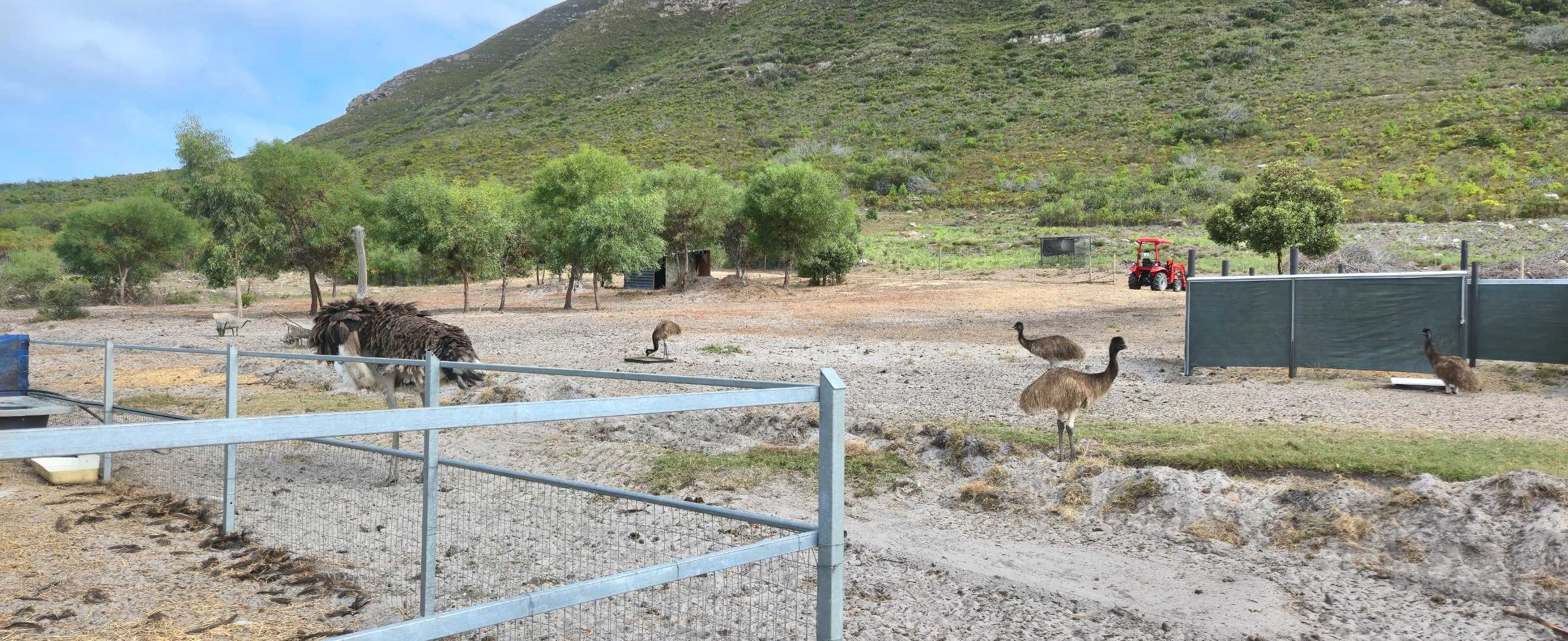 Permits are in place for various animals, and the farm currently hosts sheep, goats, pigs, geese, chickens, ostriches, and emus. Wildlife such as kudu, leopards, baboons, grysbok, and honey badgers are frequently seen, adding to the unique natural setting.