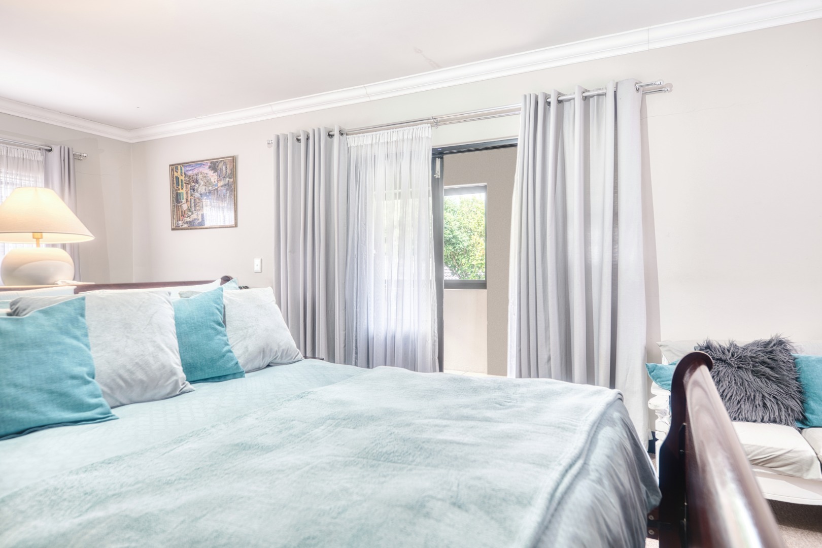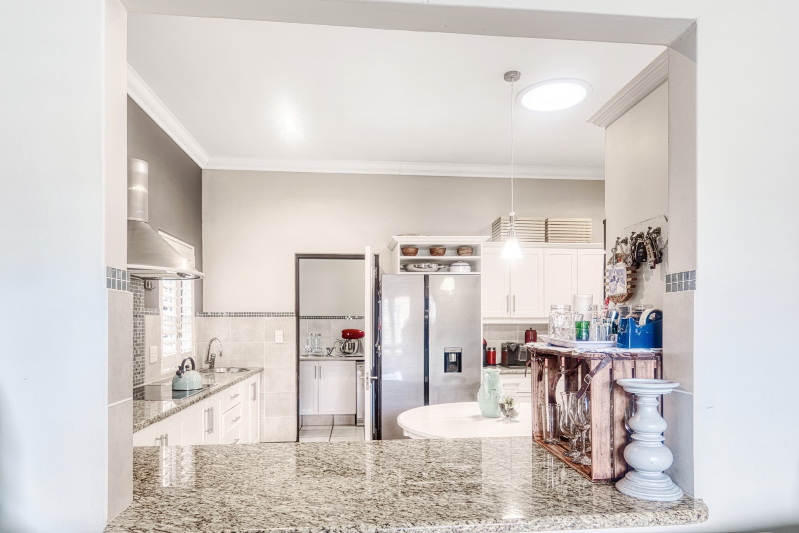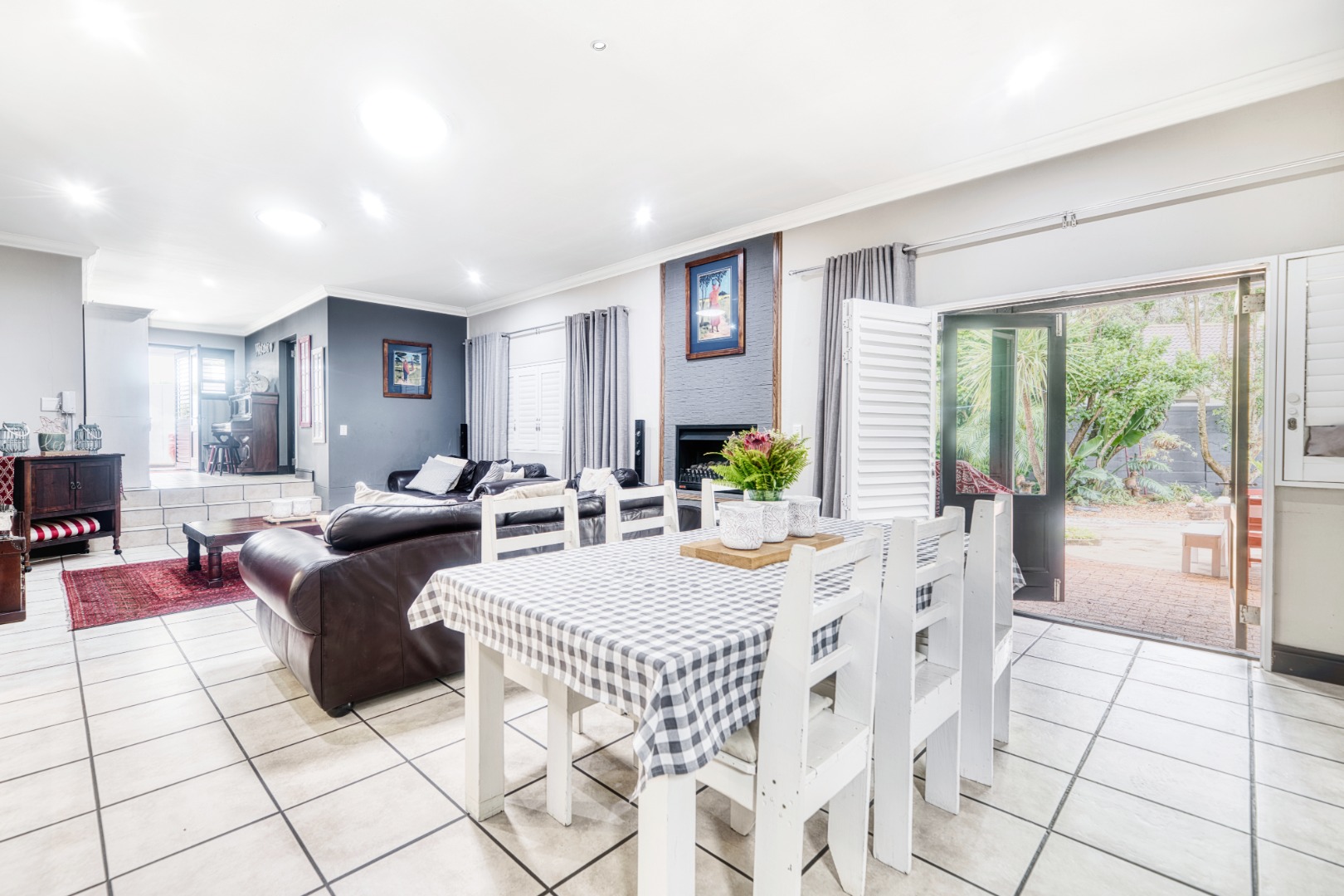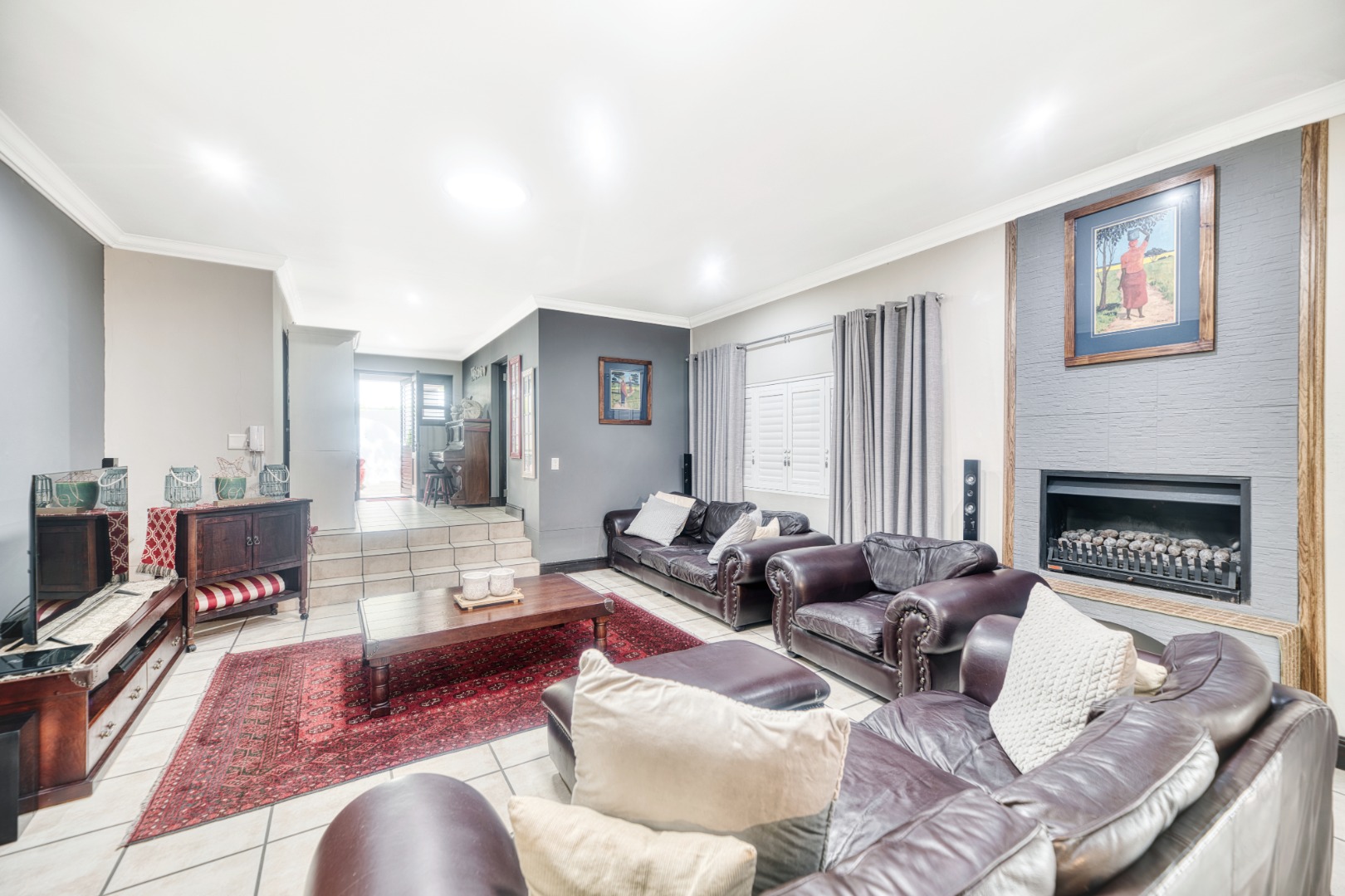 Outdoor living is well-catered for with a pool, a private garden, a patio, and a balcony offering scenic views. The property provides secure parking with a double garage and three additional parking spaces. Security features include an alarm system, access gate, intercom, burglar bars, and a totally walled perimeter, ensuring peace of mind. The inclusion of solar panels highlights a commitment to sustainable living.
