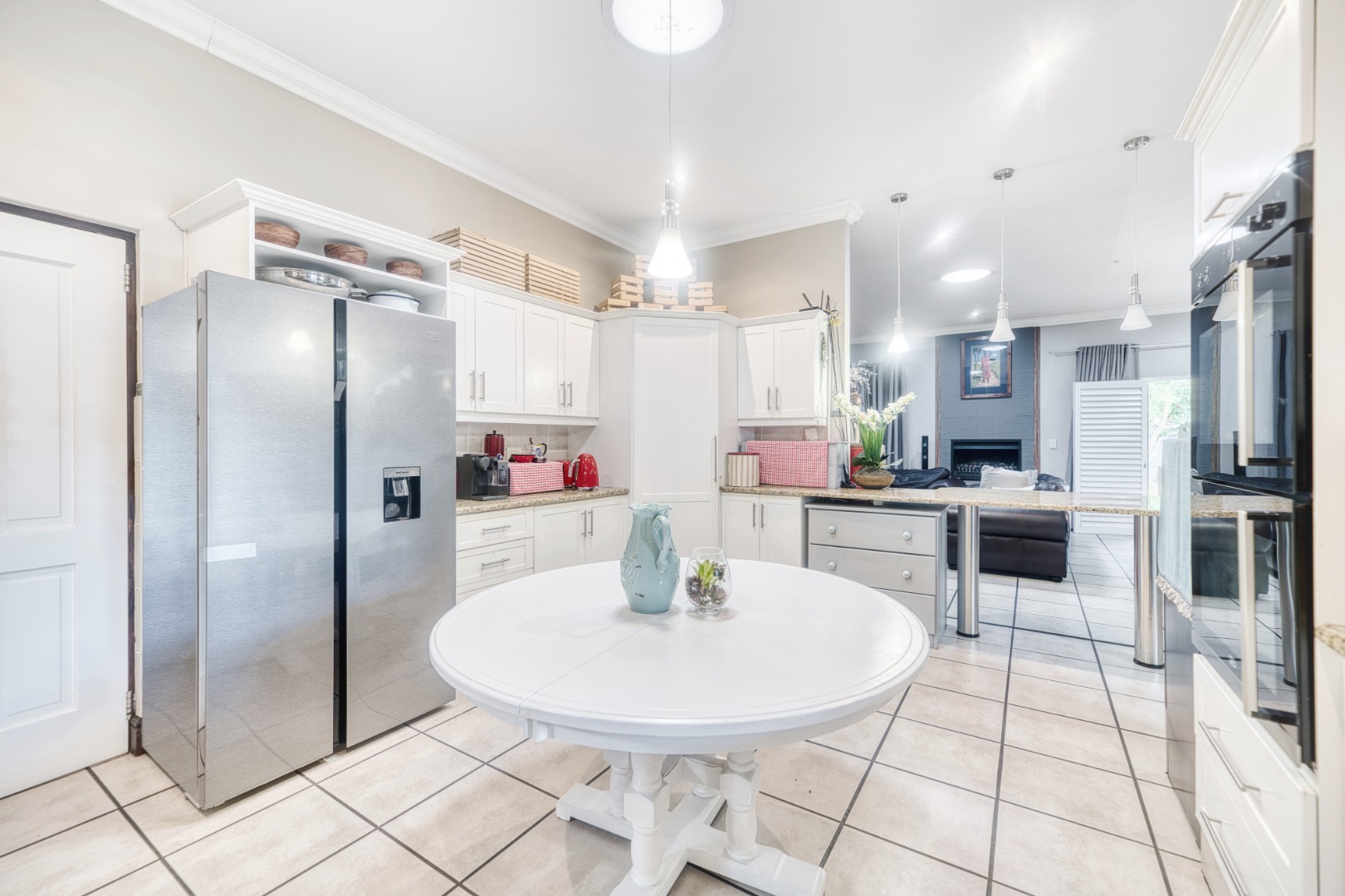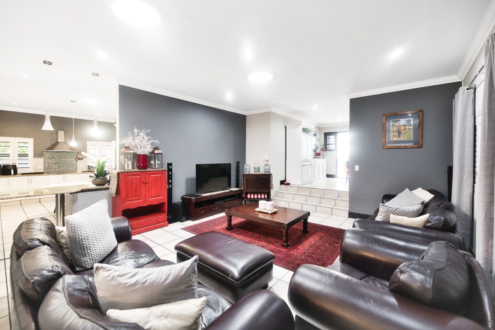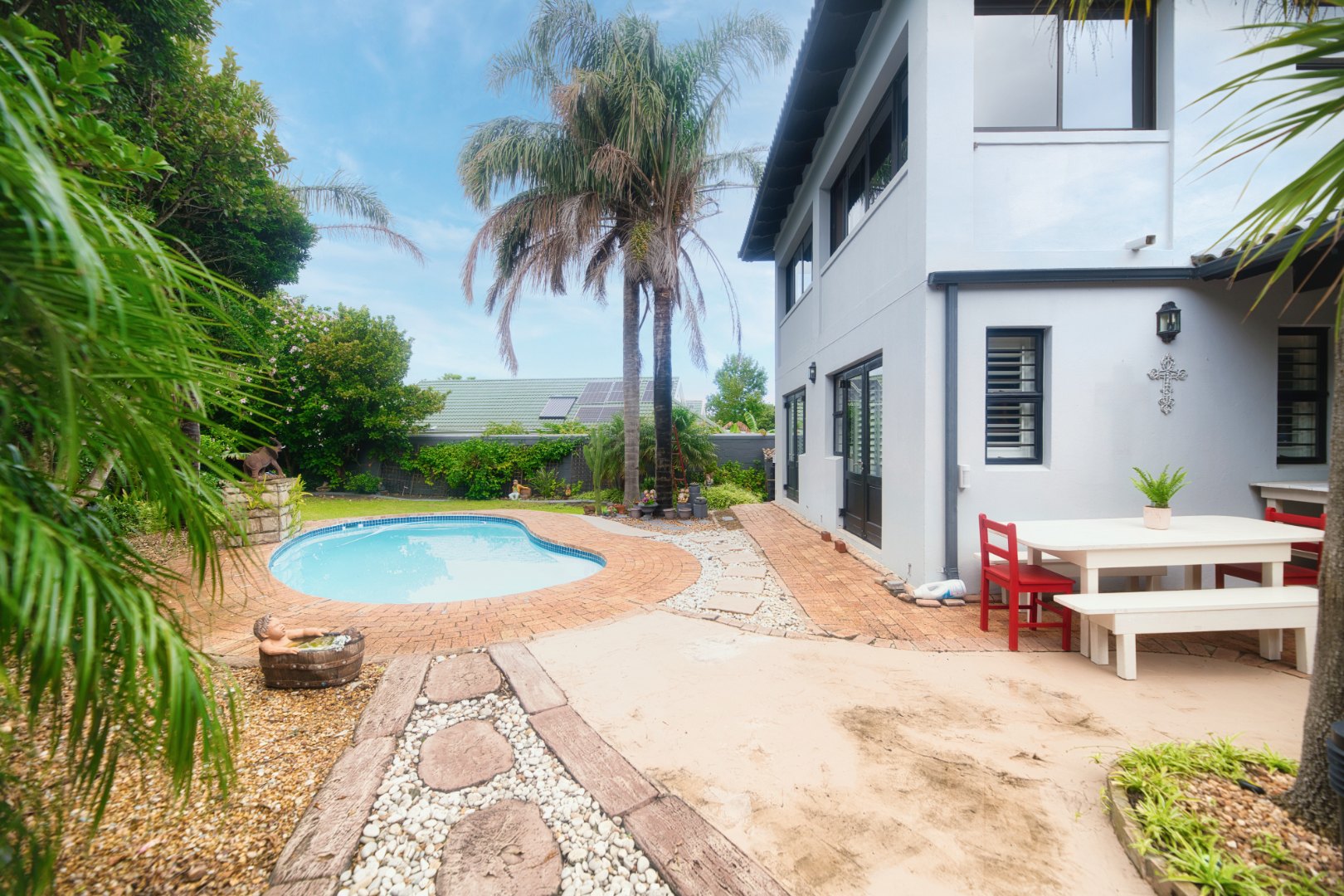 Outdoor living is well-catered for with a pool, a private garden, a patio, and a balcony offering scenic views. The property provides secure parking with a double garage and three additional parking spaces. Security features include an alarm system, access gate, intercom, burglar bars, and a totally walled perimeter, ensuring peace of mind. The inclusion of solar panels highlights a commitment to sustainable living.